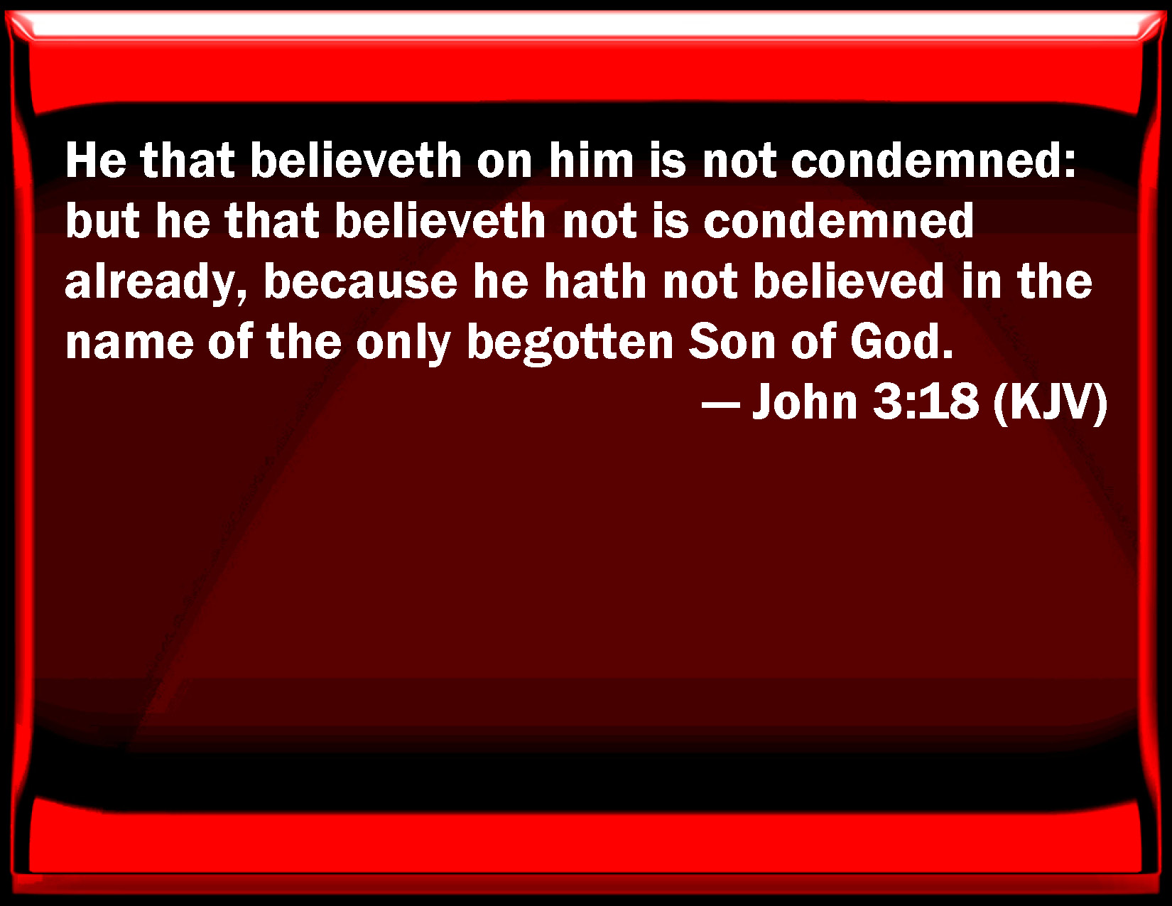 Bible Verse Slide John 3:18 He that believes on him is not condemned: but he that believes not is condemned already, because he has not believed in the name of the only begotten Son of God. KJV: He that believeth on him is not condemned: but he that believeth not is condemned already, because he hath not believed in the name of the only begotten Son of God. DRB: He that believeth in him is not judged. But he that doth not believe, is already judged: because he believeth not in the name of the only begotten Son of God. DBT: He that believes on him is not judged: but he that believes not has been already judged, because he has not believed on the name of the only-begotten Son of God. ERV: He that believeth on him is not judged: he that believeth not hath been judged already, because he hath not believed on the name of the only begotten Son of God. WBT: He that believeth on him, is not condemned: but he that believeth not, is condemned already, because he hath not believed in the name of the only-begotten Son of God. WEB: He who believes in him is not judged. He who doesn't believe has been judged already, because he has not believed in the name of the one and only Son of God. YLT: he who is believing in him is not judged, but he who is not believing hath been judged already, because he hath not believed in the name of the only begotten Son of God.Links John 3:18 NIV • John 3:18 NLT • John 3:18 ESV • John 3:18 NASB • John 3:18 KJV • John 3:18 Interlinear • John 3:18 Commentaries • John 3:18 Parallel Texts • John 3:18 Bible Apps • John 3:18 Parallel • Bible Hub |