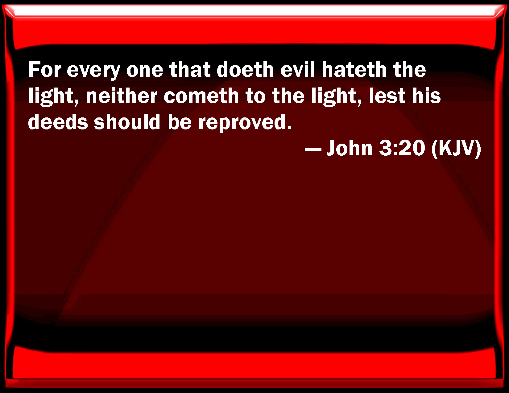 Bible Verse Slide John 3:20 For every one that does evil hates the light, neither comes to the light, lest his deeds should be reproved. KJV: For every one that doeth evil hateth the light, neither cometh to the light, lest his deeds should be reproved. DRB: For every one that doth evil hateth the light, and cometh not to the light, that his works may not be reproved. DBT: For every one that does evil hates the light, and does not come to the light that his works may not be shewn as they are; ERV: For every one that doeth ill hateth the light, and cometh not to the light, lest his works should be reproved. WBT: For every one that doeth evil hateth the light, neither cometh to the light, lest his deeds should be reproved. WEB: For everyone who does evil hates the light, and doesn't come to the light, lest his works would be exposed. YLT: for every one who is doing wicked things hateth the light, and doth not come unto the light, that his works may not be detected;Links John 3:20 NIV • John 3:20 NLT • John 3:20 ESV • John 3:20 NASB • John 3:20 KJV • John 3:20 Interlinear • John 3:20 Commentaries • John 3:20 Parallel Texts • John 3:20 Bible Apps • John 3:20 Parallel • Bible Hub |