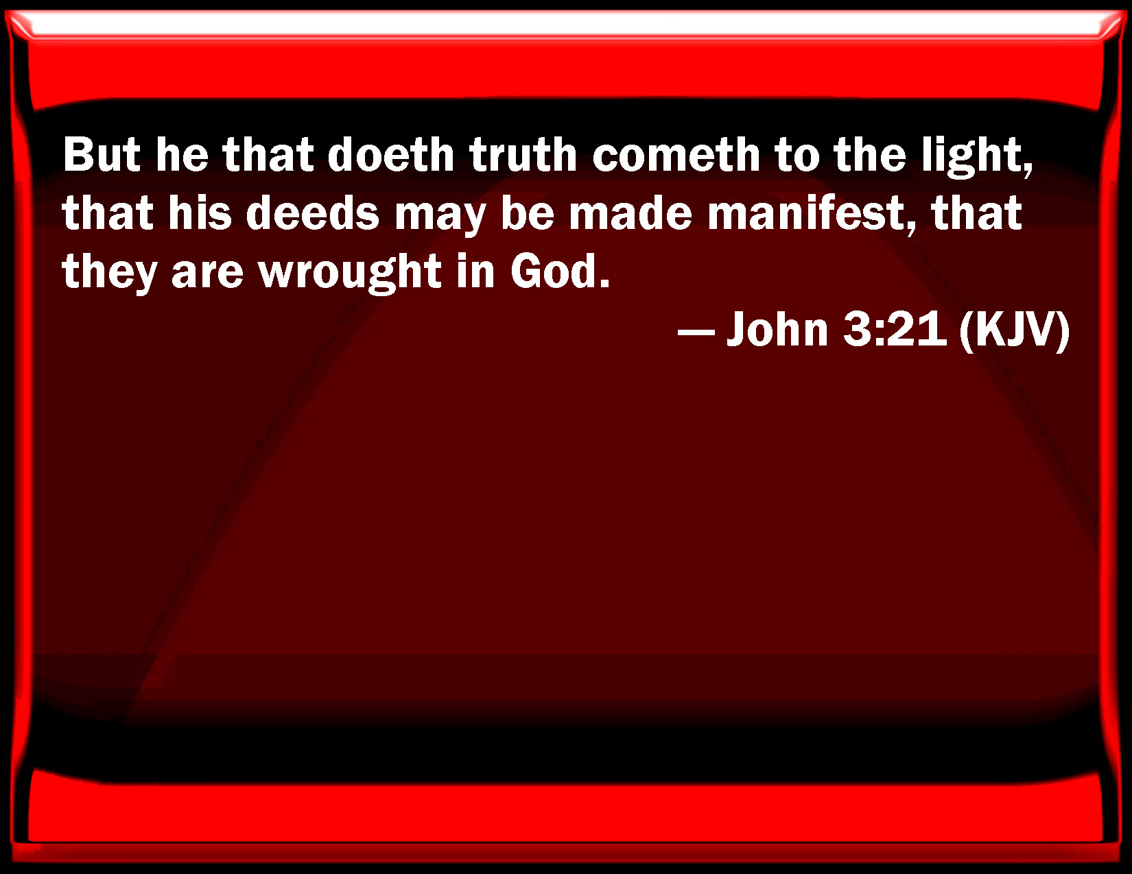 Bible Verse Slide John 3:21 But he that does truth comes to the light, that his deeds may be made manifest, that they are worked in God. KJV: But he that doeth truth cometh to the light, that his deeds may be made manifest, that they are wrought in God. DRB: But he that doth truth, cometh to the light, that his works may be made manifest, because they are done in God. DBT: but he that practises the truth comes to the light, that his works may be manifested that they have been wrought in God. ERV: But he that doeth the truth cometh to the light, that his works may be made manifest, that they have been wrought in God. WBT: But he that doeth truth, cometh to the light, that his deeds may be made manifest, that they are wrought in God. WEB: But he who does the truth comes to the light, that his works may be revealed, that they have been done in God." YLT: but he who is doing the truth doth come to the light, that his works may be manifested, that in God they are having been wrought.'Links John 3:21 NIV • John 3:21 NLT • John 3:21 ESV • John 3:21 NASB • John 3:21 KJV • John 3:21 Interlinear • John 3:21 Commentaries • John 3:21 Parallel Texts • John 3:21 Bible Apps • John 3:21 Parallel • Bible Hub |