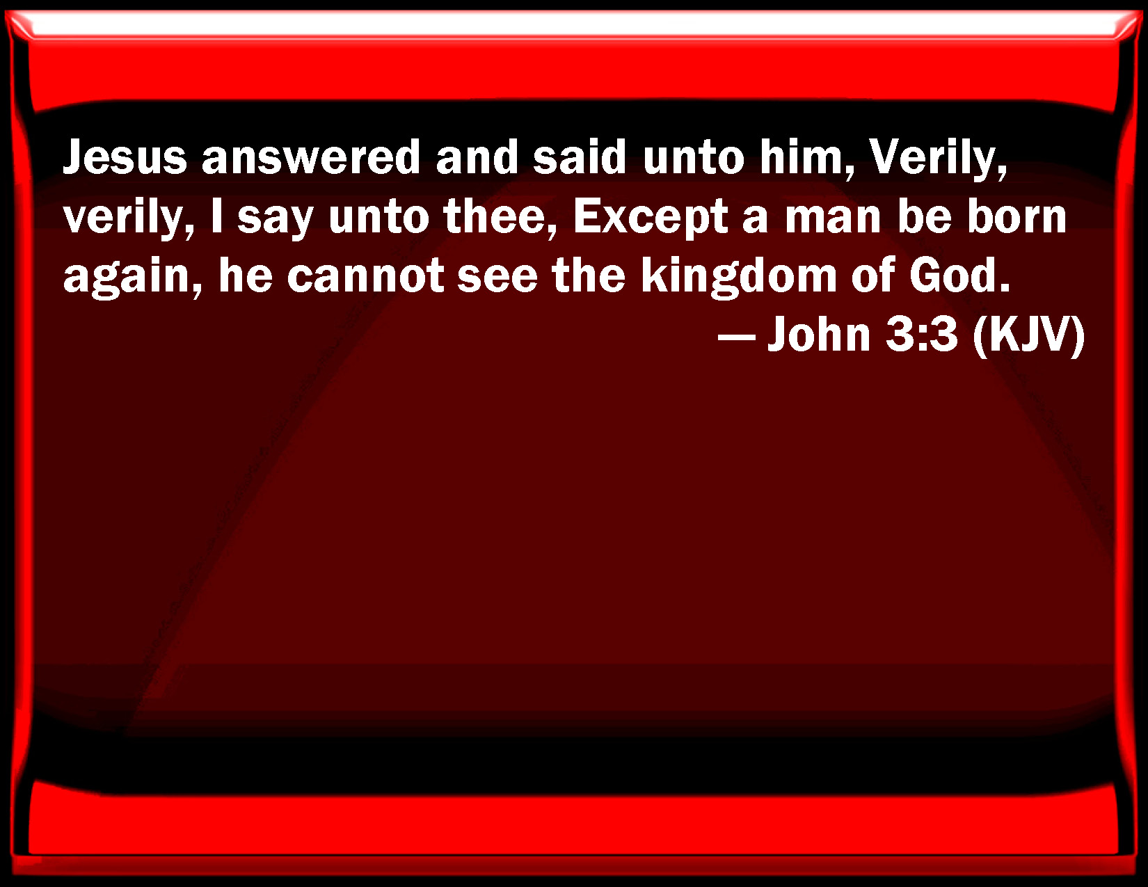 Bible Verse Slide John 3:3 Jesus answered and said to him, Truly, truly, I say to you, Except a man be born again, he cannot see the kingdom of God. KJV: Jesus answered and said unto him, Verily, verily, I say unto thee, Except a man be born again, he cannot see the kingdom of God. DRB: Jesus answered, and said to him: Amen, amen I say to thee, unless a man be born again, he cannot see the kingdom of God. DBT: Jesus answered and said to him, Verily, verily, I say unto thee, Except any one be born anew he cannot see the kingdom of God. ERV: Jesus answered and said unto him, Verily, verily, I say unto thee, Except a man be born anew, he cannot see the kingdom of God. WBT: Jesus answered and said to him, Verily, verily, I say to thee, Except a man be born again, he cannot see the kingdom of God. WEB: Jesus answered him, "Most certainly, I tell you, unless one is born anew, he can't see the Kingdom of God." YLT: Jesus answered and said to him, 'Verily, verily, I say to thee, If any one may not be born from above, he is not able to see the reign of God;'Links John 3:3 NIV • John 3:3 NLT • John 3:3 ESV • John 3:3 NASB • John 3:3 KJV • John 3:3 Interlinear • John 3:3 Commentaries • John 3:3 Parallel Texts • John 3:3 Bible Apps • John 3:3 Parallel • Bible Hub |