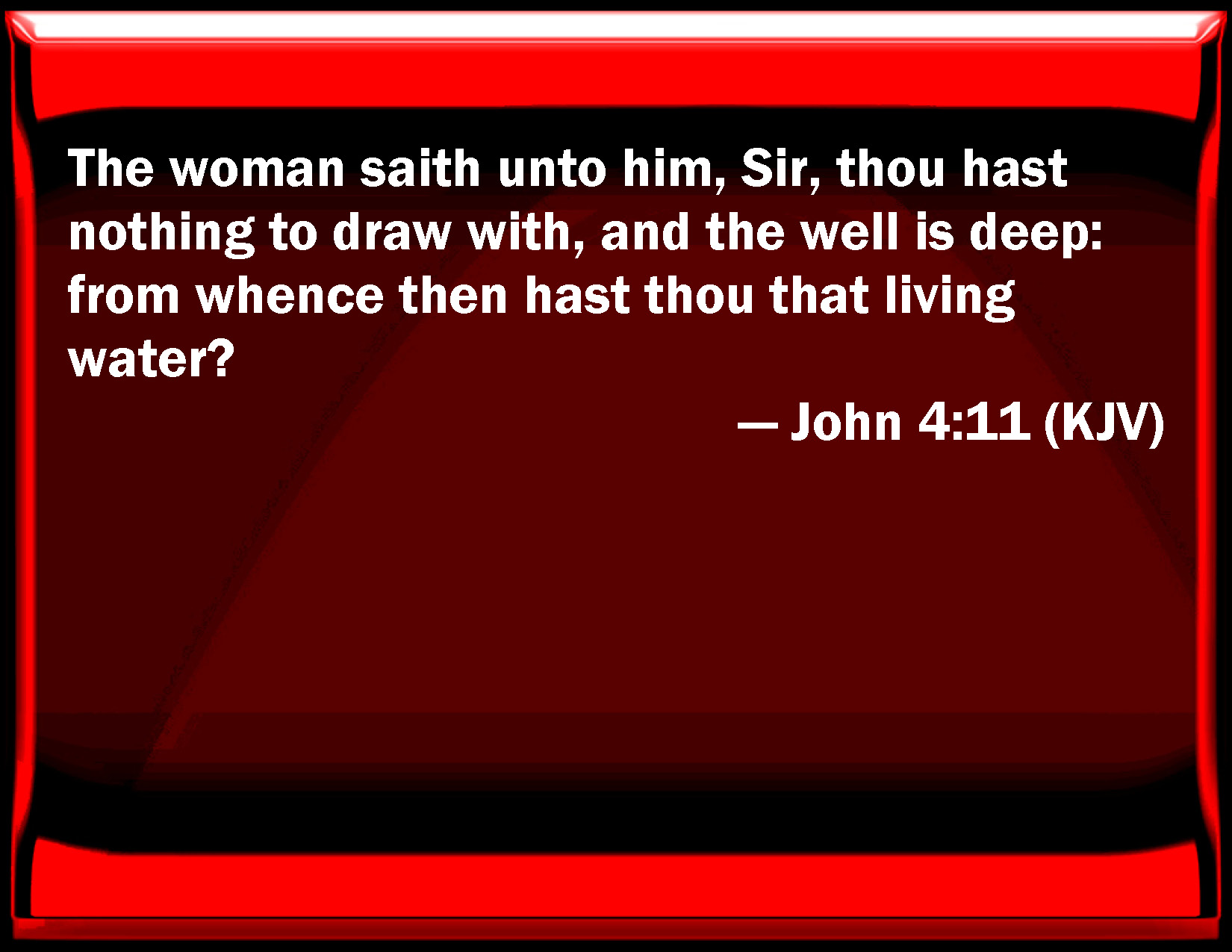 Bible Verse Slide John 4:11 The woman said to him, Sir, you have nothing to draw with, and the well is deep: from where then have you that living water? KJV: The woman saith unto him, Sir, thou hast nothing to draw with, and the well is deep: from whence then hast thou that living water? DRB: The woman saith to him: Sir, thou hast nothing wherein to draw, and the well is deep; from whence then hast thou living water? DBT: The woman says to him, Sir, thou hast nothing to draw with, and the well is deep: whence then hast thou the living water? ERV: The woman saith unto him, Sir, thou hast nothing to draw with, and the well is deep: from whence then hast thou that living water? WBT: The woman saith to him, Sir, thou hast nothing to draw with, and the well is deep: from whence then hast thou that living water? WEB: The woman said to him, "Sir, you have nothing to draw with, and the well is deep. From where then have you that living water? YLT: The woman saith to him, 'Sir, thou hast not even a vessel to draw with, and the well is deep; whence, then, hast thou the living water?Links John 4:11 NIV • John 4:11 NLT • John 4:11 ESV • John 4:11 NASB • John 4:11 KJV • John 4:11 Interlinear • John 4:11 Commentaries • John 4:11 Parallel Texts • John 4:11 Bible Apps • John 4:11 Parallel • Bible Hub |