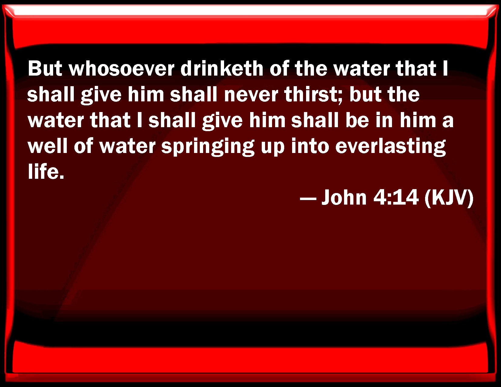 John 4:14 But whoever drinks of the water that I shall give him shall never thirst; but the water that I shall give him shall be in him a well of water springing up into everlasting life.
