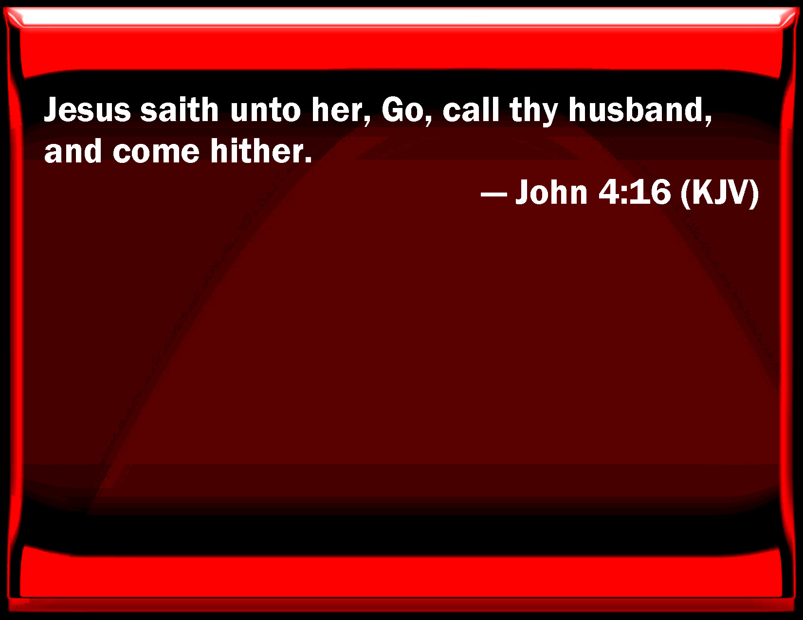 Bible Verse Slide John 4:16 Jesus said to her, Go, call your husband, and come here. KJV: Jesus saith unto her, Go, call thy husband, and come hither. DRB: Jesus saith to her: Go, call thy husband, and come hither. DBT: Jesus says to her, Go, call thy husband, and come here. ERV: Jesus saith unto her, Go, call thy husband, and come hither. WBT: Jesus saith to her, Go, call thy husband, and come hither. WEB: Jesus said to her, "Go, call your husband, and come here." YLT: Jesus saith to her, 'Go, call thy husband, and come hither;'Links John 4:16 NIV • John 4:16 NLT • John 4:16 ESV • John 4:16 NASB • John 4:16 KJV • John 4:16 Interlinear • John 4:16 Commentaries • John 4:16 Parallel Texts • John 4:16 Bible Apps • John 4:16 Parallel • Bible Hub |
