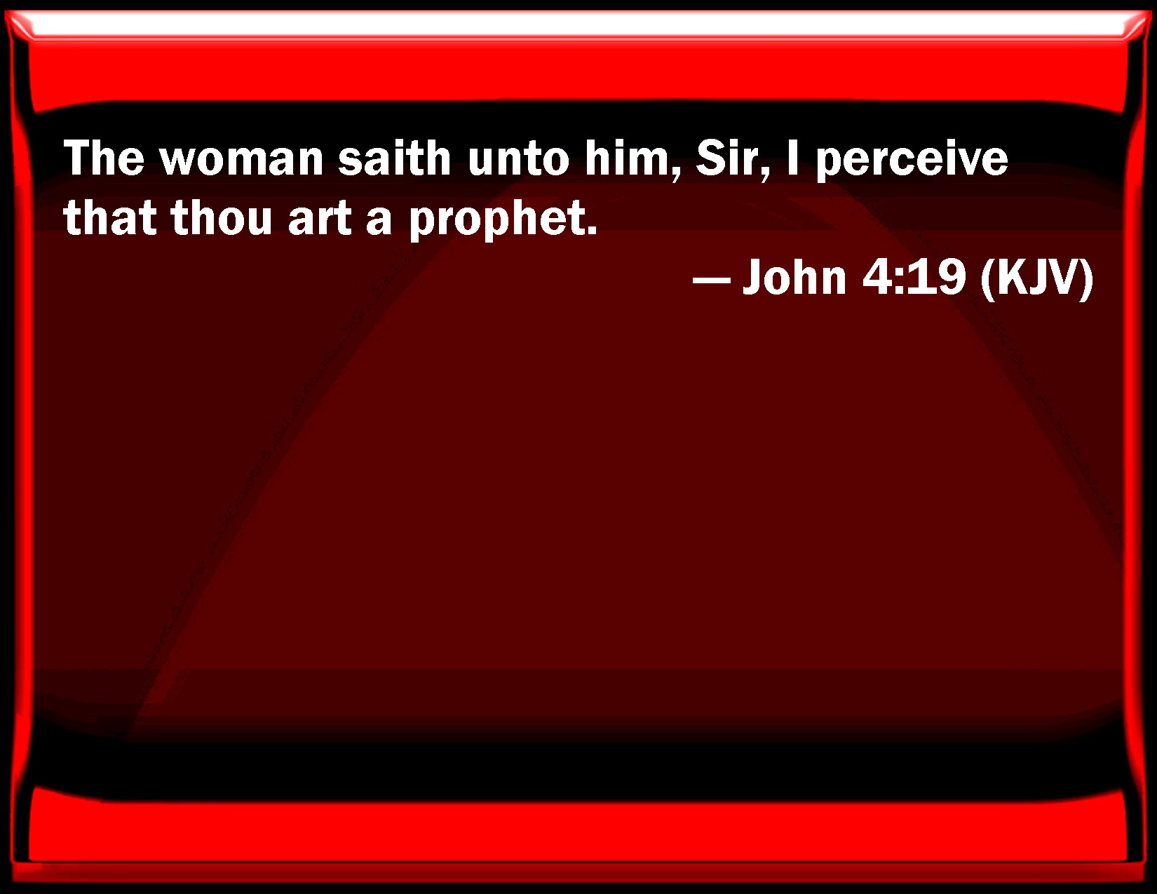 Bible Verse Slide John 4:19 The woman said to him, Sir, I perceive that you are a prophet. KJV: The woman saith unto him, Sir, I perceive that thou art a prophet. DRB: The woman saith to him: Sir, I perceive that thou art a prophet. DBT: The woman says to him, Sir, I see that thou art a prophet. ERV: The woman saith unto him, Sir, I perceive that thou art a prophet. WBT: The woman saith to him, Sir, I perceive that thou art a prophet. WEB: The woman said to him, "Sir, I perceive that you are a prophet. YLT: The woman saith to him, 'Sir, I perceive that thou art a prophet;Links John 4:19 NIV • John 4:19 NLT • John 4:19 ESV • John 4:19 NASB • John 4:19 KJV • John 4:19 Interlinear • John 4:19 Commentaries • John 4:19 Parallel Texts • John 4:19 Bible Apps • John 4:19 Parallel • Bible Hub |