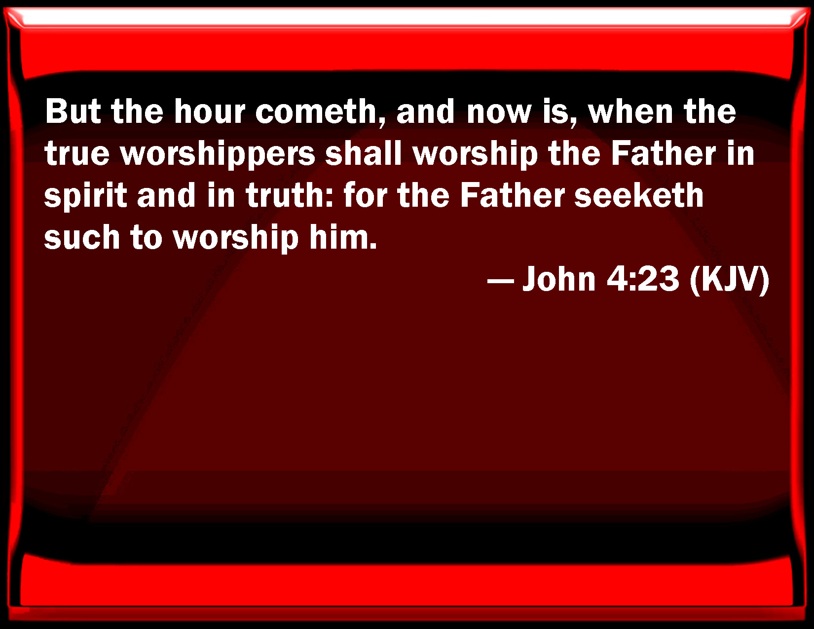 Bible Verse Slide John 4:23 But the hour comes, and now is, when the true worshippers shall worship the Father in spirit and in truth: for the Father seeks such to worship him. KJV: But the hour cometh, and now is, when the true worshippers shall worship the Father in spirit and in truth: for the Father seeketh such to worship him. DRB: But the hour cometh, and now is, when the true adorers shall adore the Father in spirit and in truth. For the Father also seeketh such to adore him. DBT: But the hour is coming and now is, when the true worshippers shall worship the Father in spirit and truth; for also the Father seeks such as his worshippers. ERV: But the hour cometh, and now is, when the true worshippers shall worship the Father in spirit and truth: for such doth the Father seek to be his worshippers. WBT: But the hour cometh, and now is, when the true worshipers shall worship the Father in spirit and in truth: for the Father seeketh such to worship him. WEB: But the hour comes, and now is, when the true worshippers will worship the Father in spirit and truth, for the Father seeks such to be his worshippers. YLT: but, there cometh an hour, and it now is, when the true worshippers will worship the Father in spirit and truth, for the Father also doth seek such to worship him;Links John 4:23 NIV • John 4:23 NLT • John 4:23 ESV • John 4:23 NASB • John 4:23 KJV • John 4:23 Interlinear • John 4:23 Commentaries • John 4:23 Parallel Texts • John 4:23 Bible Apps • John 4:23 Parallel • Bible Hub |