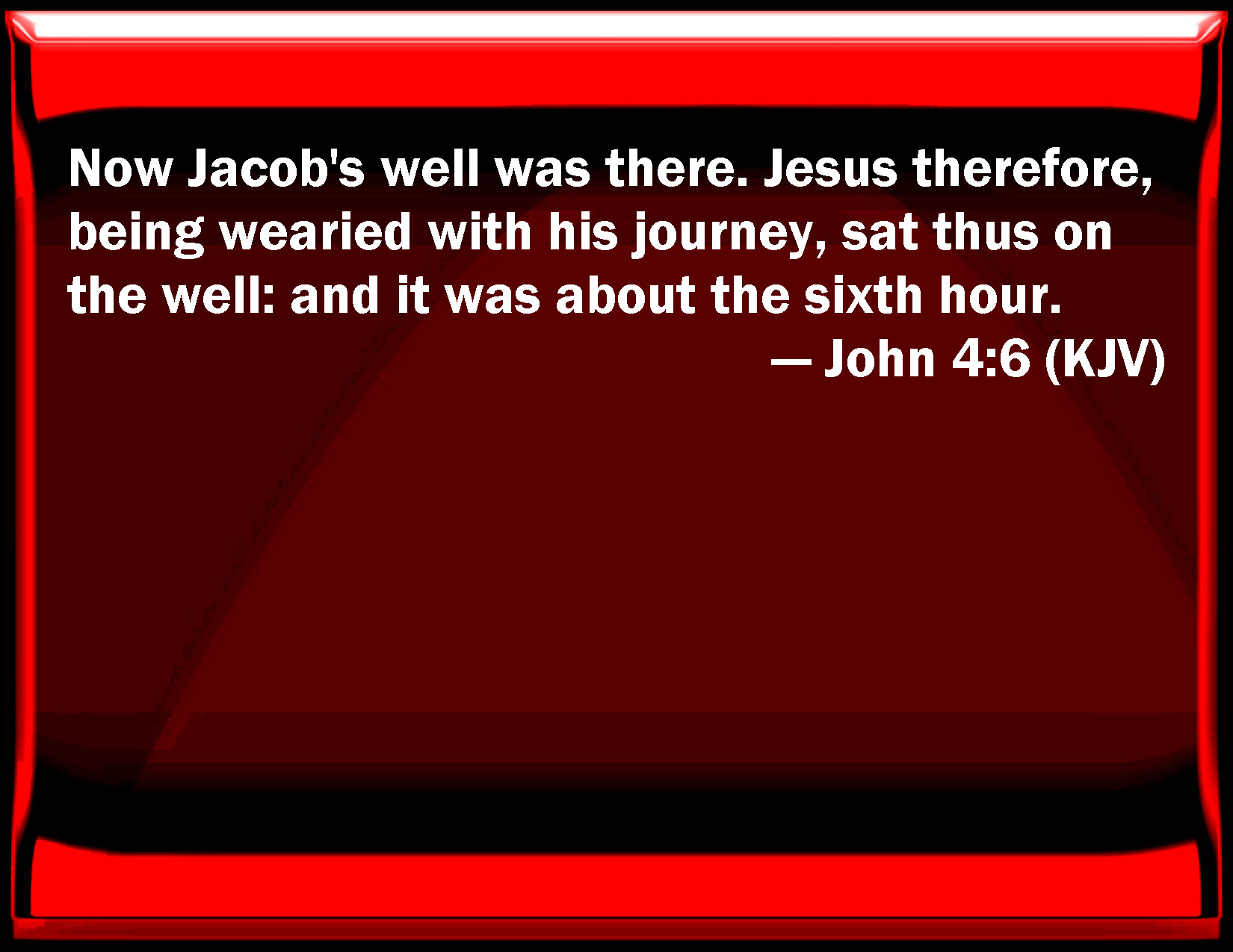 Bible Verse Slide John 4:6 Now Jacob's well was there. Jesus therefore, being wearied with his journey, sat thus on the well: and it was about the sixth hour. KJV: Now Jacob's well was there. Jesus therefore, being wearied with his journey, sat thus on the well: and it was about the sixth hour. DRB: Now Jacob's well was there. Jesus therefore being wearied with his journey, sat thus on the well. It was about the sixth hour. DBT: Now a fountain of Jacob's was there; Jesus therefore, being wearied with the way he had come, sat just as he was at the fountain. It was about the sixth hour. ERV: and Jacob's well was there. Jesus therefore, being wearied with his journey, sat thus by the well. It was about the sixth hour. WBT: Now Jacob's well was there. Jesus therefore being wearied with his journey, sat thus on the well: and it was about the sixth hour. WEB: Jacob's well was there. Jesus therefore, being tired from his journey, sat down by the well. It was about the sixth hour. YLT: and there was there a well of Jacob. Jesus therefore having been weary from the journeying, was sitting thus on the well; it was as it were the sixth hour;Links John 4:6 NIV • John 4:6 NLT • John 4:6 ESV • John 4:6 NASB • John 4:6 KJV • John 4:6 Interlinear • John 4:6 Commentaries • John 4:6 Parallel Texts • John 4:6 Bible Apps • John 4:6 Parallel • Bible Hub |