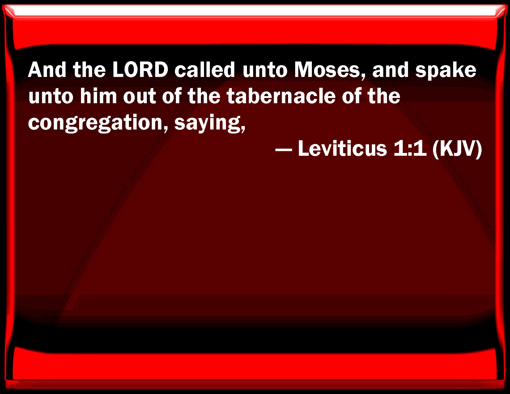 Bible Verse Slide Leviticus 1:1 And the LORD called to Moses, and spoke to him out of the tabernacle of the congregation, saying, KJV: And the LORD called unto Moses, and spake unto him out of the tabernacle of the congregation, saying, DRB: And the Lord called Moses, and spoke to him from the tabernacle of the testimony, saying: DBT: And Jehovah called to Moses and spoke to him out of the tent of meeting, saying, ERV: And the LORD called unto Moses, and spake unto him out of the tent of meeting, saying, WBT: And the LORD called to Moses, and spoke to him out of the tabernacle of the congregation, saying, WEB: Yahweh called to Moses, and spoke to him out of the Tent of Meeting, saying, YLT: And Jehovah calleth unto Moses, and speaketh unto him out of the tent of meeting, saying,Links Leviticus 1:1 NIV • Leviticus 1:1 NLT • Leviticus 1:1 ESV • Leviticus 1:1 NASB • Leviticus 1:1 KJV • Leviticus 1:1 Interlinear • Leviticus 1:1 Commentaries • Leviticus 1:1 Parallel Texts • Leviticus 1:1 Bible Apps • Leviticus 1:1 Parallel • Bible Hub |