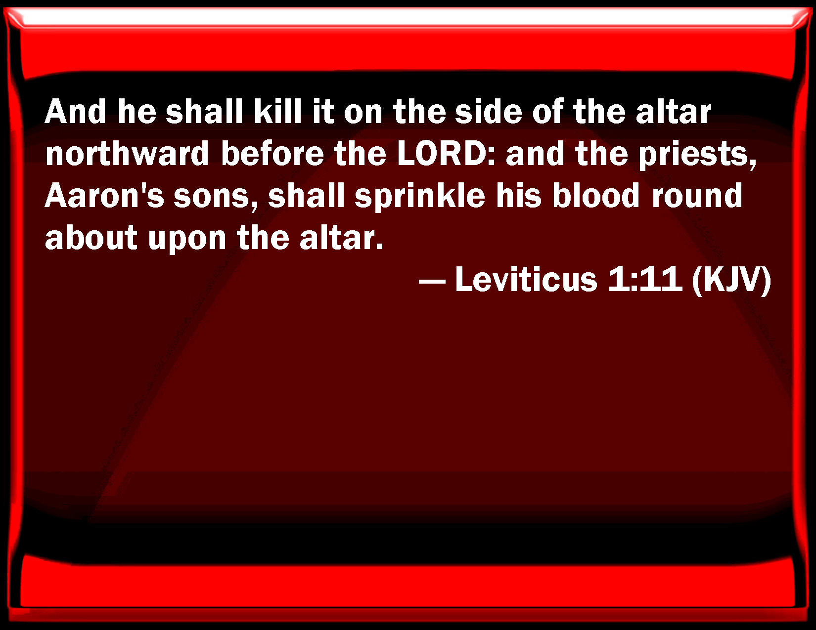 Bible Verse Slide Leviticus 1:11 And he shall kill it on the side of the altar northward before the LORD: and the priests, Aaron's sons, shall sprinkle his blood round about on the altar. KJV: And he shall kill it on the side of the altar northward before the LORD: and the priests, Aaron's sons, shall sprinkle his blood round about upon the altar. DRB: And he shall immolate it at the side of the altar that looketh to the north, before the Lord: but the sons of Aaron shall pour the blood thereof upon the altar round about: DBT: And he shall slaughter it on the side of the altar northward before Jehovah; and Aaron's sons, the priests, shall sprinkle its blood on the altar round about. ERV: And he shall kill it on the side of the altar northward before the LORD: and Aaron's sons, the priests, shall sprinkle its blood upon the altar round about. WBT: And he shall kill it on the side of the altar northward before the LORD: and the priests, Aaron's sons, shall sprinkle his blood around upon the altar: WEB: He shall kill it on the north side of the altar before Yahweh. Aaron's sons, the priests, shall sprinkle its blood around on the altar. YLT: and he hath slaughtered it by the side of the altar northward, before Jehovah; and sons of Aaron, the priests, have sprinkled its blood on the altar round about;Links Leviticus 1:11 NIV • Leviticus 1:11 NLT • Leviticus 1:11 ESV • Leviticus 1:11 NASB • Leviticus 1:11 KJV • Leviticus 1:11 Interlinear • Leviticus 1:11 Commentaries • Leviticus 1:11 Parallel Texts • Leviticus 1:11 Bible Apps • Leviticus 1:11 Parallel • Bible Hub |