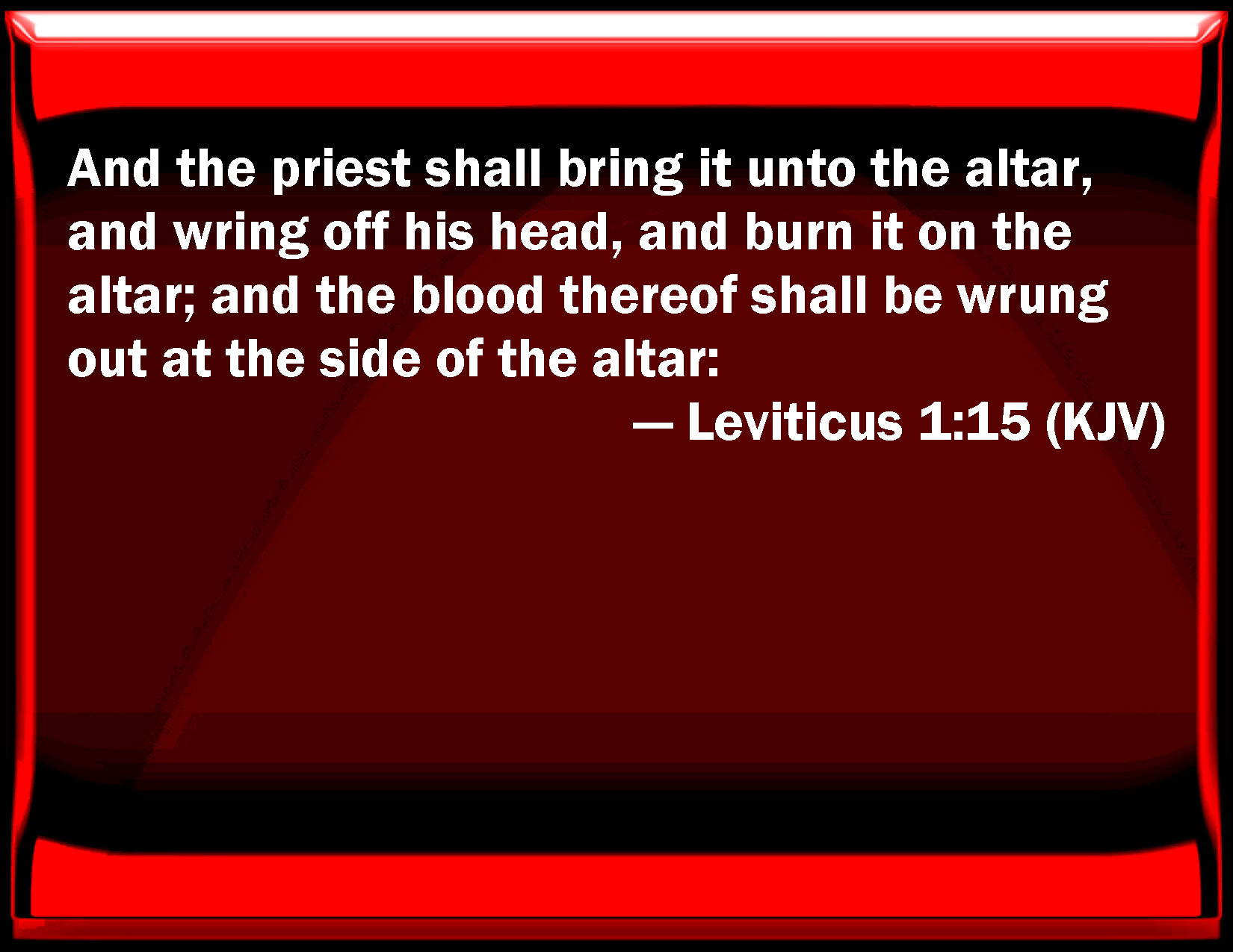 Bible Verse Slide Leviticus 1:15 And the priest shall bring it to the altar, and wring off his head, and burn it on the altar; and the blood thereof shall be wrung out at the side of the altar: KJV: And the priest shall bring it unto the altar, and wring off his head, and burn it on the altar; and the blood thereof shall be wrung out at the side of the altar: DRB: The priest shall offer it at the altar: and twisting back the neck, and breaking the place of the wound, he shall make the blood run down upon the brim of the altar. DBT: And the priest shall bring it near to the altar and pinch off its head and burn it on the altar; and its blood shall be pressed out at the side of the altar. ERV: And the priest shall bring it unto the altar, and wring off its head, and burn it on the altar; and the blood thereof shall be drained out on the side of the altar: WBT: And the priest shall bring it to the altar, and wring off its head, and burn it on the altar: and its blood shall be wrung out at the side of the altar: WEB: The priest shall bring it to the altar, and wring off its head, and burn it on the altar; and its blood shall be drained out on the side of the altar; YLT: and the priest hath brought it near unto the altar, and hath wrung off its head, and hath made perfume on the altar, and its blood hath been wrung out by the side of the altar;Links Leviticus 1:15 NIV • Leviticus 1:15 NLT • Leviticus 1:15 ESV • Leviticus 1:15 NASB • Leviticus 1:15 KJV • Leviticus 1:15 Interlinear • Leviticus 1:15 Commentaries • Leviticus 1:15 Parallel Texts • Leviticus 1:15 Bible Apps • Leviticus 1:15 Parallel • Bible Hub |