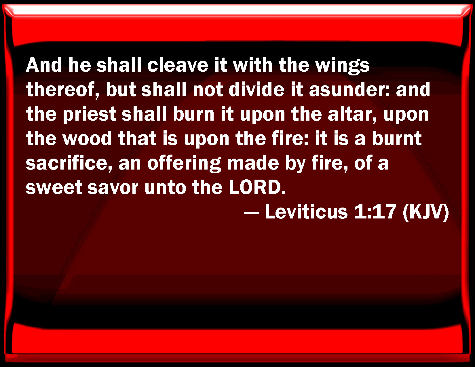 Bible Verse Slide Leviticus 1:17 And he shall split it with the wings thereof, but shall not divide it asunder: and the priest shall burn it on the altar, on the wood that is on the fire: it is a burnt sacrifice, an offering made by fire, of a sweet smell to the LORD. KJV: And he shall cleave it with the wings thereof, but shall not divide it asunder: and the priest shall burn it upon the altar, upon the wood that is upon the fire: it is a burnt sacrifice, an offering made by fire, of a sweet savour unto the LORD. DRB: And he shall break the pinions thereof, and shall not cut, nor divide it with a knife, and shall burn it upon the altar, putting fire under the wood. It is a holocaust and oblation of most sweet savour to the Lord. DBT: and he shall split it open at its wings, but shall not divide it asunder; and the priest shall burn it on the altar on the wood that is on the fire: it is a burnt-offering, an offering by fire to Jehovah of a sweet odour. ERV: and he shall rend it by the wings thereof, but shall not divide it asunder: and the priest shall burn it upon the altar, upon the wood that is upon the fire: it is a burnt offering, an offering made by fire, of a sweet savour unto the LORD. WBT: And he shall cleave it with its wings, but shall not divide it asunder: and the priest shall burn it upon the altar, upon the wood that is upon the fire: it is a burnt sacrifice, an offering made by fire, of a sweet savor to the LORD. WEB: He shall tear it by its wings, but shall not divide it apart. The priest shall burn it on the altar, on the wood that is on the fire. It is a burnt offering, an offering made by fire, of a pleasant aroma to Yahweh. YLT: and he hath cleaved it with its wings (he doth not separate it), and the priest hath made it a perfume on the altar, on the wood, which is on the fire; it is a burnt-offering, a fire-offering of sweet fragrance to Jehovah.Links Leviticus 1:17 NIV • Leviticus 1:17 NLT • Leviticus 1:17 ESV • Leviticus 1:17 NASB • Leviticus 1:17 KJV • Leviticus 1:17 Interlinear • Leviticus 1:17 Commentaries • Leviticus 1:17 Parallel Texts • Leviticus 1:17 Bible Apps • Leviticus 1:17 Parallel • Bible Hub |