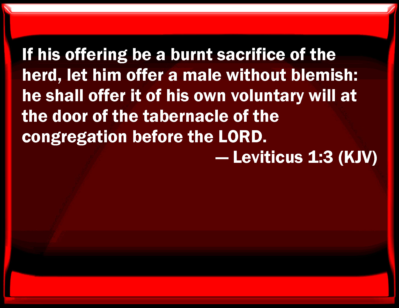 Bible Verse Slide Leviticus 1:3 If his offering be a burnt sacrifice of the herd, let him offer a male without blemish: he shall offer it of his own voluntary will at the door of the tabernacle of the congregation before the LORD. KJV: If his offering be a burnt sacrifice of the herd, let him offer a male without blemish: he shall offer it of his own voluntary will at the door of the tabernacle of the congregation before the LORD. DRB: If his offering be a holocaust, and of the herd, he shall offer a male without blemish, at the door of the testimony, to make the Lord favourable to him: DBT: If his offering be a burnt-offering of the herd, he shall present it a male without blemish: at the entrance of the tent of meeting shall he present it, for his acceptance before Jehovah. ERV: If his oblation be a burnt offering of the herd, he shall offer it a male without blemish: he shall offer it at the door of the tent of meeting, that he may be accepted before the LORD. WBT: If his offering shall be a burnt-sacrifice of the herd, let him offer a male without blemish: he shall offer it of his own voluntary will at the door of the tabernacle of the congregation before the LORD. WEB: "'If his offering is a burnt offering from the herd, he shall offer a male without blemish. He shall offer it at the door of the Tent of Meeting, that he may be accepted before Yahweh. YLT: If his offering is a burnt-offering out of the herd — a male, a perfect one, he doth bring near, unto the opening of the tent of meeting he doth bring it near, at his pleasure, before Jehovah;Links Leviticus 1:3 NIV • Leviticus 1:3 NLT • Leviticus 1:3 ESV • Leviticus 1:3 NASB • Leviticus 1:3 KJV • Leviticus 1:3 Interlinear • Leviticus 1:3 Commentaries • Leviticus 1:3 Parallel Texts • Leviticus 1:3 Bible Apps • Leviticus 1:3 Parallel • Bible Hub |