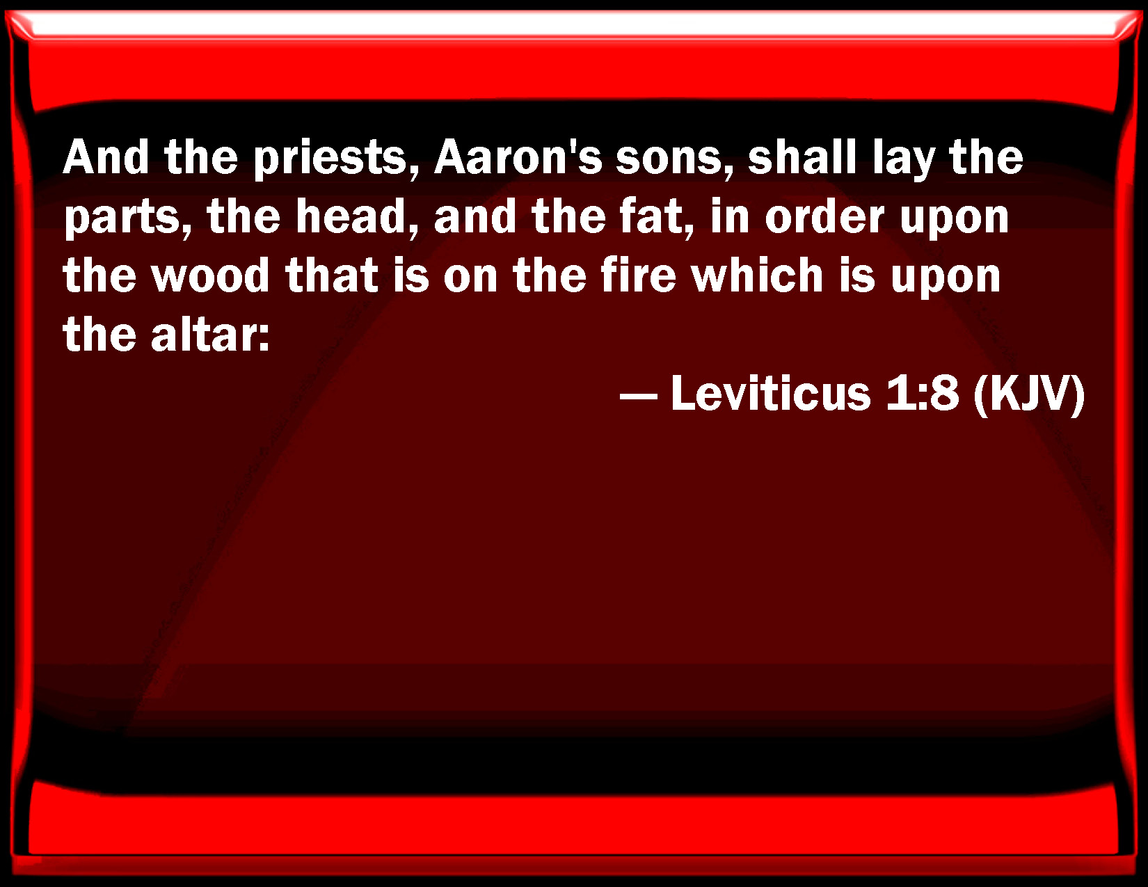 Bible Verse Slide Leviticus 1:8 And the priests, Aaron's sons, shall lay the parts, the head, and the fat, in order on the wood that is on the fire which is on the altar: KJV: And the priests, Aaron's sons, shall lay the parts, the head, and the fat, in order upon the wood that is on the fire which is upon the altar: DRB: And they shall lay the parts that are cut out in order thereupon, to wit, the head, and all things that cleave to the liver, DBT: and Aaron's sons, the priests, shall lay the pieces, the head, and the fat, in order on the wood that is on the fire which is on the altar; ERV: and Aaron's sons, the priests, shall lay the pieces, the head, and the fat, in order upon the wood that is on the fire which is upon the altar: WBT: And the priests, Aaron's sons, shall lay the parts, the head, and the fat, in order upon the wood that is on the fire which is upon the altar. WEB: and Aaron's sons, the priests, shall lay the pieces, the head, and the fat in order on the wood that is on the fire which is on the altar; YLT: and sons of Aaron, the priests, have arranged the pieces, with the head and the fat, on the wood, which is on the fire, which is on the altar;Links Leviticus 1:8 NIV • Leviticus 1:8 NLT • Leviticus 1:8 ESV • Leviticus 1:8 NASB • Leviticus 1:8 KJV • Leviticus 1:8 Interlinear • Leviticus 1:8 Commentaries • Leviticus 1:8 Parallel Texts • Leviticus 1:8 Bible Apps • Leviticus 1:8 Parallel • Bible Hub |