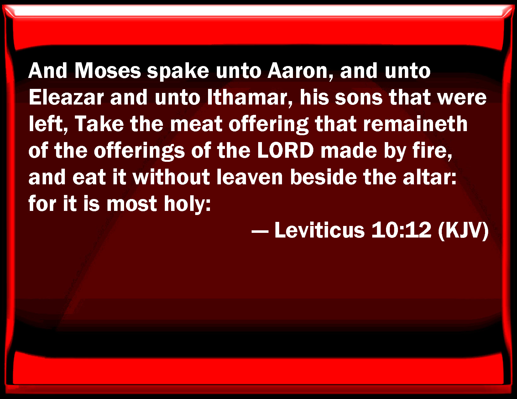 Bible Verse Slide Leviticus 10:12 And Moses spoke to Aaron, and to Eleazar and to Ithamar, his sons that were left, Take the meat offering that remains of the offerings of the LORD made by fire, and eat it without leaven beside the altar: for it is most holy: KJV: And Moses spake unto Aaron, and unto Eleazar and unto Ithamar, his sons that were left, Take the meat offering that remaineth of the offerings of the LORD made by fire, and eat it without leaven beside the altar: for it is most holy: DRB: And Moses spoke to Aaron, and to Eleazar and Ithamar, his sons that were left: Take the sacrifice that is remaining of the oblation of the Lord, and eat it without leaven beside the altar, because it is holy of holies. DBT: And Moses spoke to Aaron, and to Eleazar and to Ithamar, his sons that were left, Take the oblation that is left of Jehovah's offerings by fire, and eat it with unleavened bread beside the altar; for it is most holy. ERV: And Moses spake unto Aaron, and unto Eleazar and unto Ithamar, his sons that were left, Take the meal offering that remaineth of the offerings of the LORD made by fire, and eat it without leaven beside the altar: for it is most holy: WBT: And Moses spoke to Aaron, and to Eleazar and to Ithamar, his sons that were left, Take the meat-offering that remaineth of the offerings of the LORD made by fire, and eat it without leaven beside the altar: for it is most holy: WEB: Moses spoke to Aaron, and to Eleazar and to Ithamar, his sons who were left, "Take the meal offering that remains of the offerings of Yahweh made by fire, and eat it without yeast beside the altar; for it is most holy; YLT: And Moses speaketh unto Aaron, and unto Eleazar, and unto Ithamar his sons, who are left, 'Take ye the present that is left from the fire-offerings of Jehovah, and eat it unleavened near the altar, for it is most holy,Links Leviticus 10:12 NIV • Leviticus 10:12 NLT • Leviticus 10:12 ESV • Leviticus 10:12 NASB • Leviticus 10:12 KJV • Leviticus 10:12 Interlinear • Leviticus 10:12 Commentaries • Leviticus 10:12 Parallel Texts • Leviticus 10:12 Bible Apps • Leviticus 10:12 Parallel • Bible Hub |