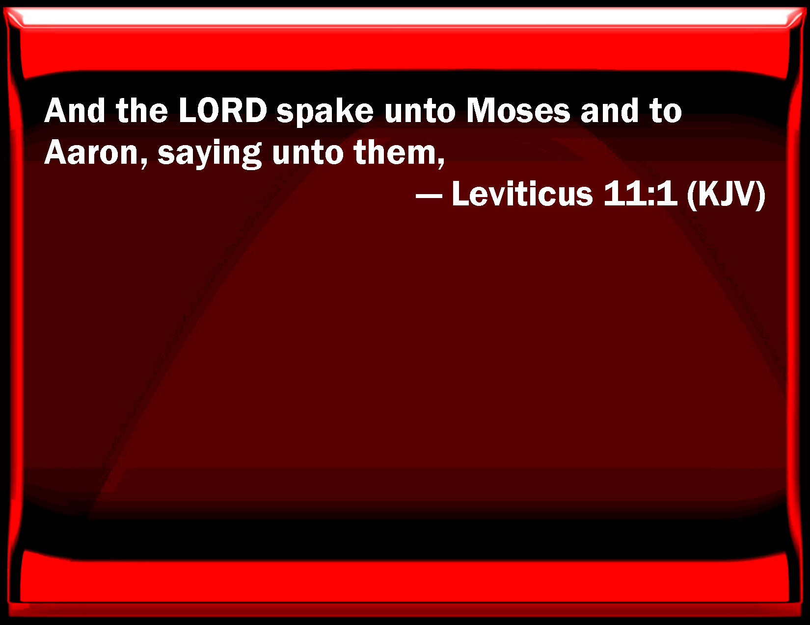 Bible Verse Slide Leviticus 11:1 And the LORD spoke to Moses and to Aaron, saying to them, KJV: And the LORD spake unto Moses and to Aaron, saying unto them, DRB: And the Lord spoke to Moses and Aaron, saying: DBT: And Jehovah spoke to Moses and to Aaron, saying to them, ERV: And the LORD spake unto Moses and to Aaron, saying unto them, WBT: And the LORD spoke to Moses and to Aaron, saying to them. WEB: Yahweh spoke to Moses and to Aaron, saying to them, YLT: And Jehovah speaketh unto Moses and unto Aaron, saying unto them,Links Leviticus 11:1 NIV • Leviticus 11:1 NLT • Leviticus 11:1 ESV • Leviticus 11:1 NASB • Leviticus 11:1 KJV • Leviticus 11:1 Interlinear • Leviticus 11:1 Commentaries • Leviticus 11:1 Parallel Texts • Leviticus 11:1 Bible Apps • Leviticus 11:1 Parallel • Bible Hub |