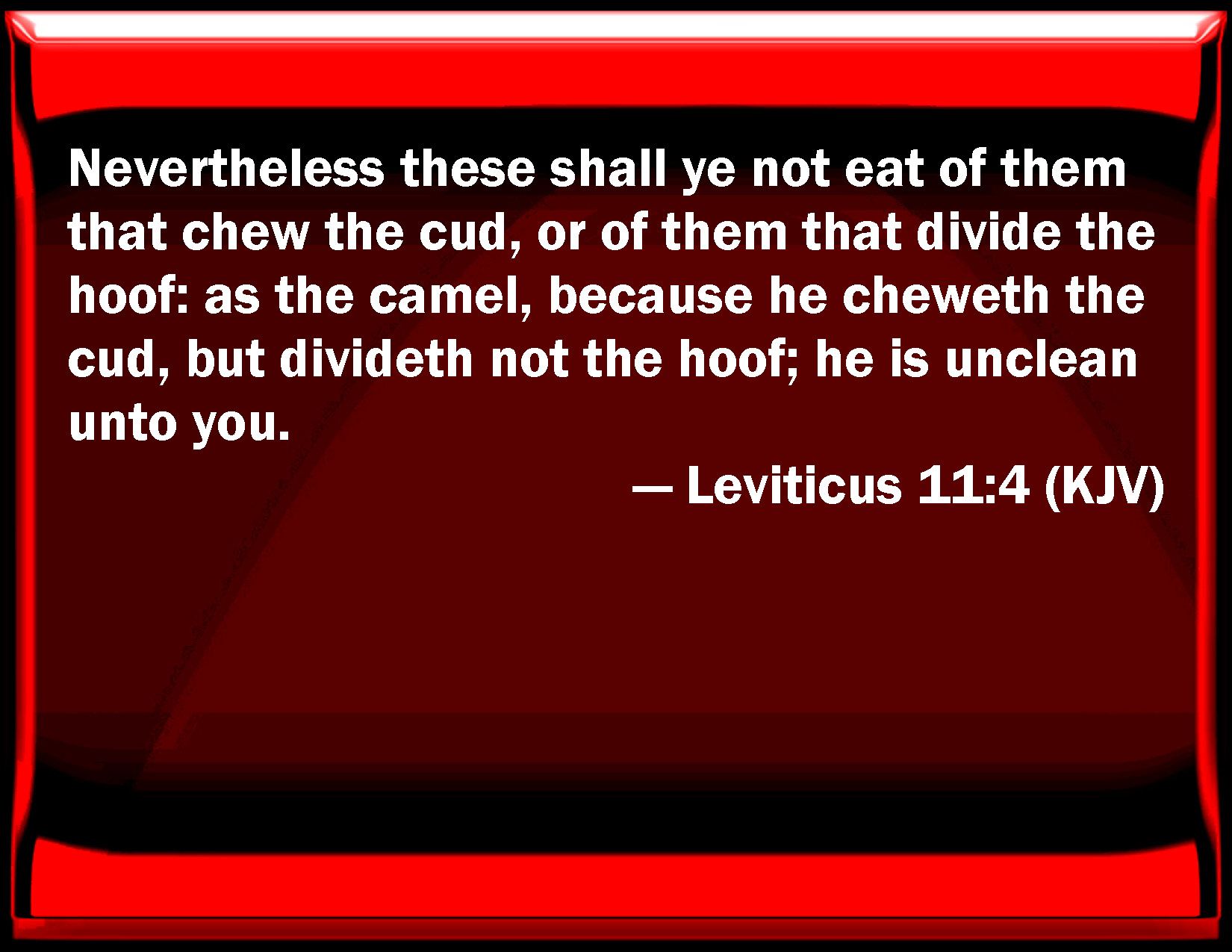 Bible Verse Slide Leviticus 11:4 Nevertheless these shall you not eat of them that chew the cud, or of them that divide the hoof: as the camel, because he chews the cud, but divides not the hoof; he is unclean to you. KJV: Nevertheless these shall ye not eat of them that chew the cud, or of them that divide the hoof: as the camel, because he cheweth the cud, but divideth not the hoof; he is unclean unto you. DRB: But whatsoever cheweth indeed the cud, and hath a hoof, but divideth it not, as the camel, and others, that you shall not eat, but shall reckon it among the unclean. DBT: Only these shall ye not eat of those that chew the cud, or of those with cloven hoofs: the camel, for it cheweth the cud, but hath not cloven hoofs it shall be unclean unto you; ERV: Nevertheless these shall ye not eat of them that chew the cud, or of them that part the hoof: the camel, because he cheweth the cud but parteth not the hoof, he is unclean unto you. WBT: Nevertheless, these shall ye not eat, of them that chew the cud, or of them that divide the hoof: the camel, because he cheweth the cud, but divideth not the hoof; he is unclean to you. WEB: "'Nevertheless these you shall not eat of those that chew the cud, or of those who part the hoof: the camel, because he chews the cud but doesn't have a parted hoof, he is unclean to you. YLT: Only, this ye do not eat — of those bringing up the cud, and of those dividing the hoof — the camel, though it is bringing up the cud, yet the hoof not dividing — it is unclean to you;Links Leviticus 11:4 NIV • Leviticus 11:4 NLT • Leviticus 11:4 ESV • Leviticus 11:4 NASB • Leviticus 11:4 KJV • Leviticus 11:4 Interlinear • Leviticus 11:4 Commentaries • Leviticus 11:4 Parallel Texts • Leviticus 11:4 Bible Apps • Leviticus 11:4 Parallel • Bible Hub |