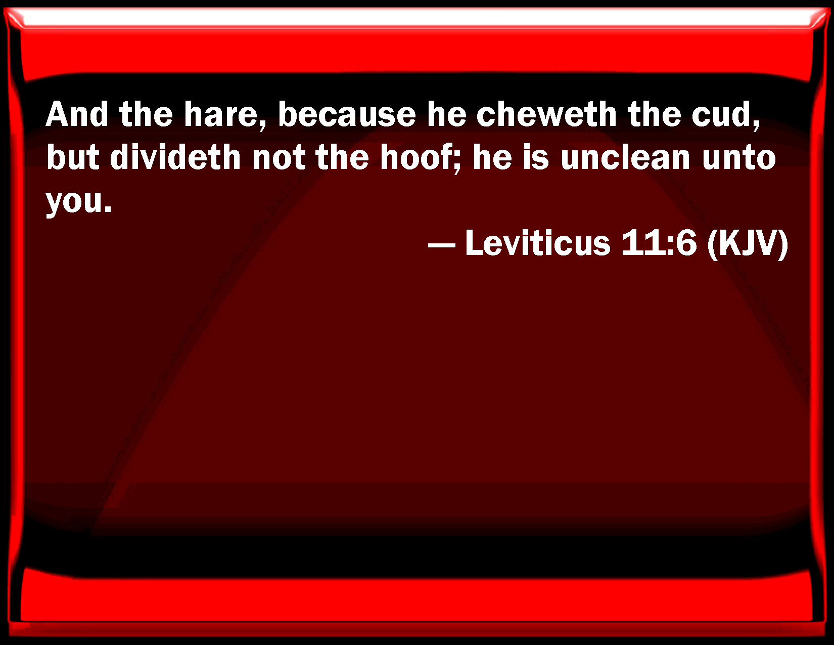 Bible Verse Slide Leviticus 11:6 And the hare, because he chews the cud, but divides not the hoof; he is unclean to you. KJV: And the hare, because he cheweth the cud, but divideth not the hoof; he is unclean unto you. DRB: The hare also: for that too cheweth the cud, but divideth not the hoof. DBT: and the hare, for it cheweth the cud, but hath not cloven hoofs it shall be unclean unto you; ERV: And the hare, because she cheweth the cud but parteth not the hoof, she is unclean unto you. WBT: And the hare, because he cheweth the cud, but divideth not the hoof: he is unclean to you. WEB: The hare, because she chews the cud but doesn't part the hoof, she is unclean to you. YLT: and the hare, though it is bringing up the cud, yet the hoof hath not divided — unclean it is to you;Links Leviticus 11:6 NIV • Leviticus 11:6 NLT • Leviticus 11:6 ESV • Leviticus 11:6 NASB • Leviticus 11:6 KJV • Leviticus 11:6 Interlinear • Leviticus 11:6 Commentaries • Leviticus 11:6 Parallel Texts • Leviticus 11:6 Bible Apps • Leviticus 11:6 Parallel • Bible Hub |