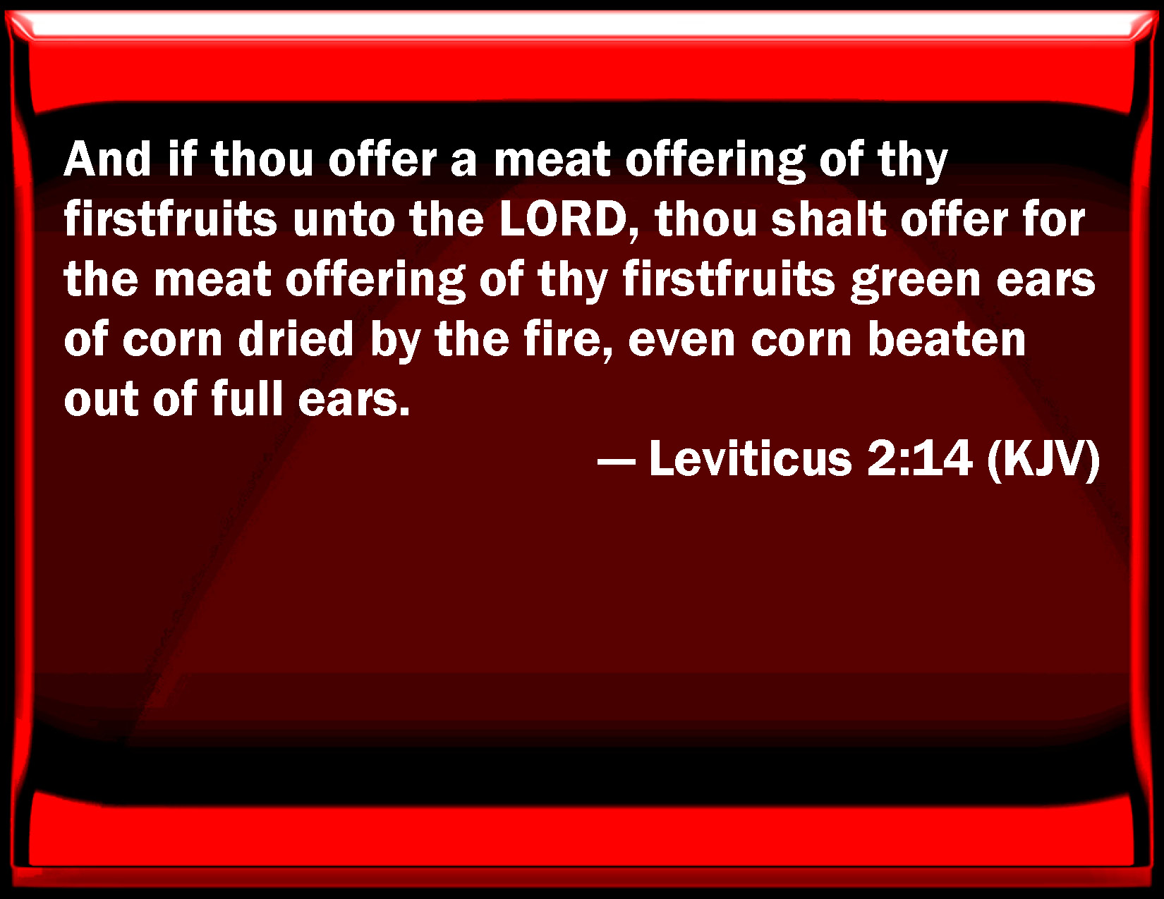 Bible Verse Slide Leviticus 2:14 And if you offer a meat offering of your first fruits to the LORD, you shall offer for the meat offering of your first fruits green ears of corn dried by the fire, even corn beaten out of full ears. KJV: And if thou offer a meat offering of thy firstfruits unto the LORD, thou shalt offer for the meat offering of thy firstfruits green ears of corn dried by the fire, even corn beaten out of full ears. DRB: But if thou offer a gift of the firstfruits of thy corn to the Lord, of the ears yet green, thou shalt dry it at the fire, and break it small like meal, and so shalt thou offer thy firstfruits to the Lord, DBT: And if thou present an oblation of thy first-fruits to Jehovah, thou shalt present as the oblation of thy first-fruits green ears of corn roasted in fire, corn beaten out of full ears. ERV: And if thou offer a meal offering of firstfruits unto the LORD, thou shalt offer for the meal offering of thy firstfruits corn in the ear parched with fire, bruised corn of the fresh ear. WBT: And if thou shalt offer a meat-offering of thy first-fruits to the LORD, thou shalt offer for the meat-offering of thy first-fruits, green ears of corn dried by the fire, even corn beaten out of full ears. WEB: "'If you offer a meal offering of first fruits to Yahweh, you shall offer for the meal offering of your first fruits grain in the ear parched with fire, bruised grain of the fresh ear. YLT: And if thou bring near a present of first-ripe fruits to Jehovah, — of green ears, roasted with fire, beaten out corn of a fruitful field thou dost bring near the present of thy first-ripe fruits,Links Leviticus 2:14 NIV • Leviticus 2:14 NLT • Leviticus 2:14 ESV • Leviticus 2:14 NASB • Leviticus 2:14 KJV • Leviticus 2:14 Interlinear • Leviticus 2:14 Commentaries • Leviticus 2:14 Parallel Texts • Leviticus 2:14 Bible Apps • Leviticus 2:14 Parallel • Bible Hub |
