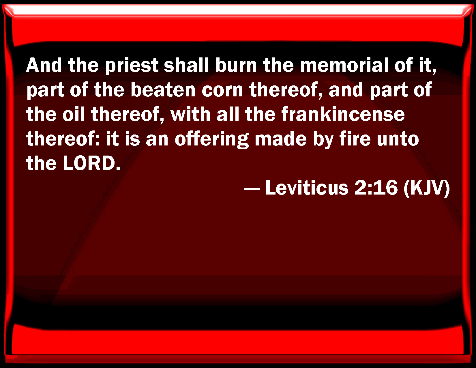 Bible Verse Slide Leviticus 2:16 And the priest shall burn the memorial of it, part of the beaten corn thereof, and part of the oil thereof, with all the frankincense thereof: it is an offering made by fire to the LORD. KJV: And the priest shall burn the memorial of it, part of the beaten corn thereof, and part of the oil thereof, with all the frankincense thereof: it is an offering made by fire unto the LORD. DRB: Whereof the priest shall burn for a memorial of the gift, part of the corn broken small and of the oil, and all the frankincense. DBT: And the priest shall burn the memorial thereof, part of the beaten corn thereof, and part of the oil thereof, with all the frankincense thereof: it is an offering by fire to Jehovah. ERV: And the priest shall burn the memorial of it, part of the bruised corn thereof, and part of the oil thereof, with all the frankincense thereof: it is an offering made by fire unto the LORD. WBT: And the priest shall burn the memorial of it, part of its beaten corn, and part of its oil, with all its frankincense: it is an offering made by fire to the LORD. WEB: The priest shall burn as its memorial, part of its bruised grain, and part of its oil, along with all its frankincense: it is an offering made by fire to Yahweh. YLT: and the priest hath made perfume with its memorial from its beaten out corn, and from its oil, besides all its frankincense — a fire-offering to Jehovah.Links Leviticus 2:16 NIV • Leviticus 2:16 NLT • Leviticus 2:16 ESV • Leviticus 2:16 NASB • Leviticus 2:16 KJV • Leviticus 2:16 Interlinear • Leviticus 2:16 Commentaries • Leviticus 2:16 Parallel Texts • Leviticus 2:16 Bible Apps • Leviticus 2:16 Parallel • Bible Hub |