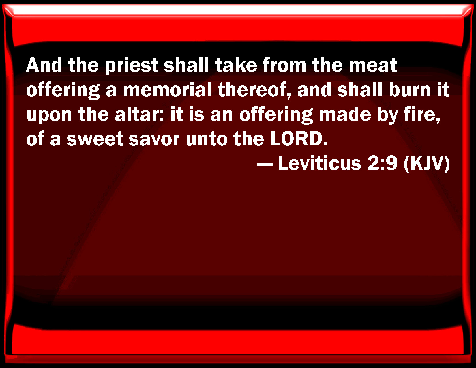 Bible Verse Slide Leviticus 2:9 And the priest shall take from the meat offering a memorial thereof, and shall burn it on the altar: it is an offering made by fire, of a sweet smell to the LORD. KJV: And the priest shall take from the meat offering a memorial thereof, and shall burn it upon the altar: it is an offering made by fire, of a sweet savour unto the LORD. DRB: And when he hath offered it, he shall take a memorial out of the sacrifice, and burn it upon the altar for a sweet savour to the Lord. DBT: And the priest shall take from the oblation a memorial thereof, and shall burn it on the altar, an offering by fire to Jehovah of a sweet odour. ERV: And the priest shall take up from the meal offering the memorial thereof, and shall burn it upon the altar: an offering made by fire, of a sweet savour unto the LORD. WBT: And the priest shall take from the meat-offering a memorial of it, and shall burn it upon the altar: it is an offering made by fire, of a sweet savor to the LORD. WEB: The priest shall take from the meal offering its memorial, and shall burn it on the altar, an offering made by fire, of a pleasant aroma to Yahweh. YLT: and the priest hath lifted up from the present its memorial, and hath made perfume on the altar, a fire-offering of sweet fragrance to Jehovah;Links Leviticus 2:9 NIV • Leviticus 2:9 NLT • Leviticus 2:9 ESV • Leviticus 2:9 NASB • Leviticus 2:9 KJV • Leviticus 2:9 Interlinear • Leviticus 2:9 Commentaries • Leviticus 2:9 Parallel Texts • Leviticus 2:9 Bible Apps • Leviticus 2:9 Parallel • Bible Hub |