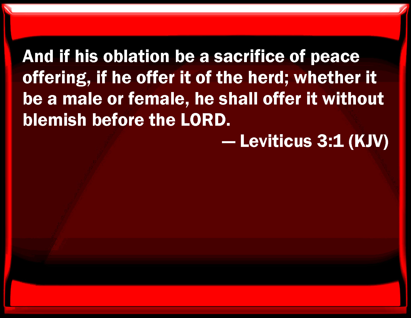 Bible Verse Slide Leviticus 3:1 And if his oblation be a sacrifice of peace offering, if he offer it of the herd; whether it be a male or female, he shall offer it without blemish before the LORD. KJV: And if his oblation be a sacrifice of peace offering, if he offer it of the herd; whether it be a male or female, he shall offer it without blemish before the LORD. DRB: And if his oblation be a sacrifice of peace offerings, and he will offer of the herd, whether male or female, he shall offer them without blemish before the Lord. DBT: And if his offering be a sacrifice of peace-offering, if he present it of the herd, whether a male or female, he shall present it without blemish before Jehovah. ERV: And if his oblation be a sacrifice of peace offerings; if he offer of the herd, whether male or female, he shall offer it without blemish before the LORD. WBT: And if his oblation shall be a sacrifice of peace-offering, if he shall offer it of the herd, whether a male or female; he shall offer it without blemish before the LORD. WEB: "'If his offering is a sacrifice of peace offerings; if he offers it from the herd, whether male or female, he shall offer it without blemish before Yahweh. YLT: And if his offering is a sacrifice of peace-offerings, if out of the herd he is bringing near, whether male or female, a perfect one he doth bring near before Jehovah,Links Leviticus 3:1 NIV • Leviticus 3:1 NLT • Leviticus 3:1 ESV • Leviticus 3:1 NASB • Leviticus 3:1 KJV • Leviticus 3:1 Interlinear • Leviticus 3:1 Commentaries • Leviticus 3:1 Parallel Texts • Leviticus 3:1 Bible Apps • Leviticus 3:1 Parallel • Bible Hub |
