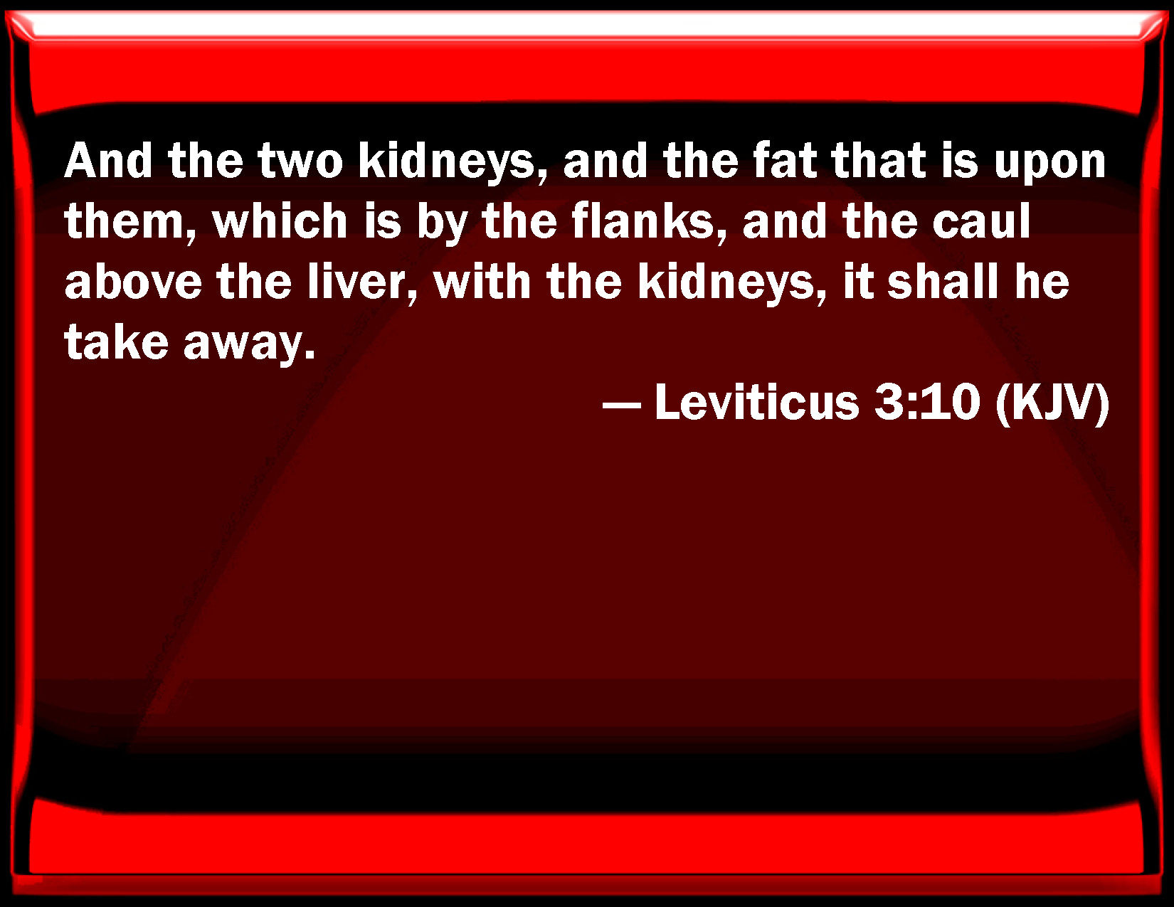 Bible Verse Slide Leviticus 3:10 And the two kidneys, and the fat that is on them, which is by the flanks, and the lobe above the liver, with the kidneys, it shall he take away. KJV: And the two kidneys, and the fat that is upon them, which is by the flanks, and the caul above the liver, with the kidneys, it shall he take away. DRB: With the kidneys, and the fat that covereth the belly and all the vitals and both the little kidneys, with the fat that is about the flanks, and the caul of the liver with the little kidneys. DBT: and the two kidneys, and the fat that is on them, which is by the flanks, and the net above the liver which he shall take away as far as the kidneys; ERV: and the two kidneys, and the fat that is upon them, which is by the loins, and the caul upon the liver, with the kidneys, shall he take away. WBT: And the two kidneys, and the fat that is upon them, which is by the flanks, and the caul above the liver, with the kidneys, that shall he take away. WEB: and the two kidneys, and the fat that is on them, which is by the loins, and the cover on the liver, with the kidneys, he shall take away. YLT: and the two kidneys, and the fat which is on them, which is on the flanks, and the redundance above the liver, (beside the kidneys he doth turn it aside),Links Leviticus 3:10 NIV • Leviticus 3:10 NLT • Leviticus 3:10 ESV • Leviticus 3:10 NASB • Leviticus 3:10 KJV • Leviticus 3:10 Interlinear • Leviticus 3:10 Commentaries • Leviticus 3:10 Parallel Texts • Leviticus 3:10 Bible Apps • Leviticus 3:10 Parallel • Bible Hub |