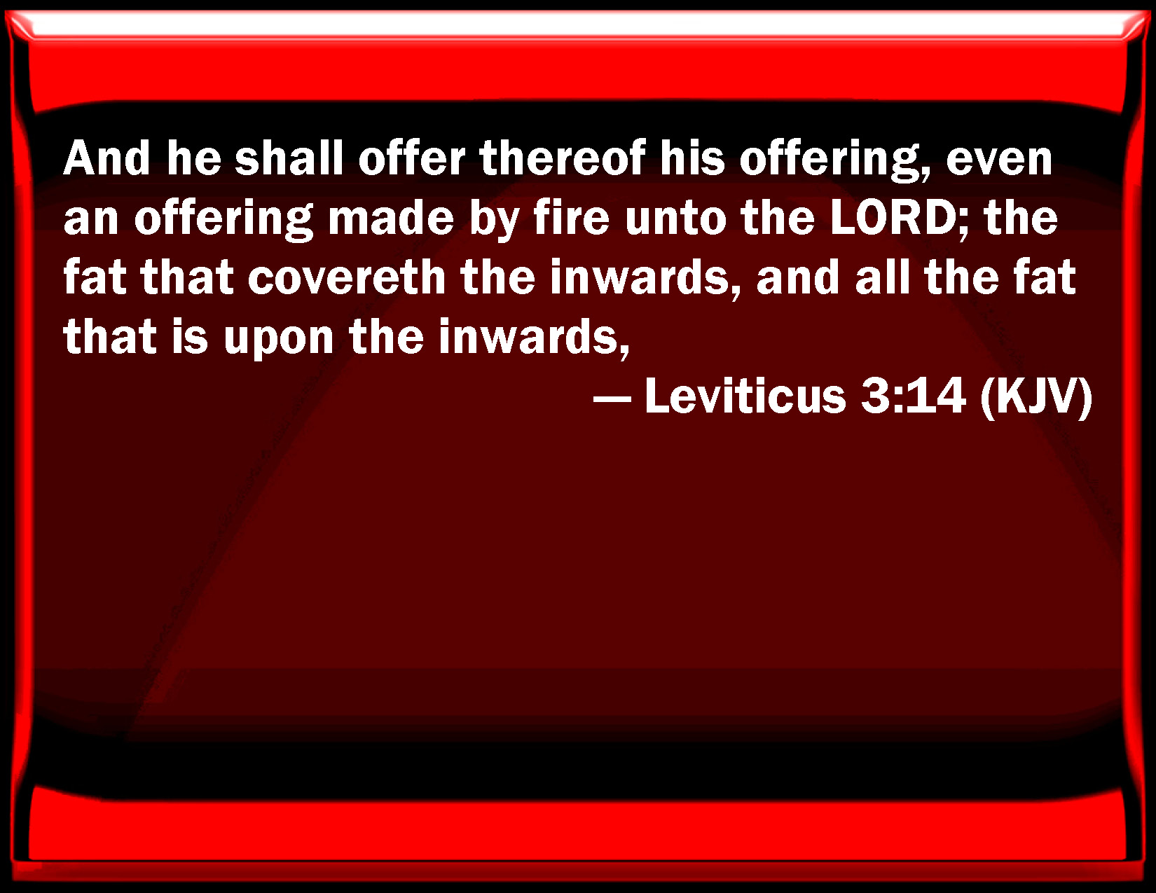 Bible Verse Slide Leviticus 3:14 And he shall offer thereof his offering, even an offering made by fire to the LORD; the fat that covers the inwards, and all the fat that is on the inwards, KJV: And he shall offer thereof his offering, even an offering made by fire unto the LORD; the fat that covereth the inwards, and all the fat that is upon the inwards, DRB: And they shall take of it for the food of the Lord's fire, the fat that covereth the belly, and that covereth all the vital parts : DBT: And he shall present thereof his offering, an offering by fire to Jehovah; the fat that covereth the inwards and all the fat that is on the inwards, ERV: And he shall offer thereof his oblation, even an offering made by fire unto the LORD; the fat that covereth the inwards, and all the fat that is upon the inwards, WBT: And he shall offer of it his offering, even an offering made by fire to the LORD; the fat that covereth the inwards, and all the fat that is upon the inwards, WEB: He shall offer from it as his offering, an offering made by fire to Yahweh; the fat that covers the innards, and all the fat that is on the innards, YLT: and he hath brought near from it his offering, a fire-offering to Jehovah, the fat which is covering the inwards, and all the fat which is on the inwards,Links Leviticus 3:14 NIV • Leviticus 3:14 NLT • Leviticus 3:14 ESV • Leviticus 3:14 NASB • Leviticus 3:14 KJV • Leviticus 3:14 Interlinear • Leviticus 3:14 Commentaries • Leviticus 3:14 Parallel Texts • Leviticus 3:14 Bible Apps • Leviticus 3:14 Parallel • Bible Hub |