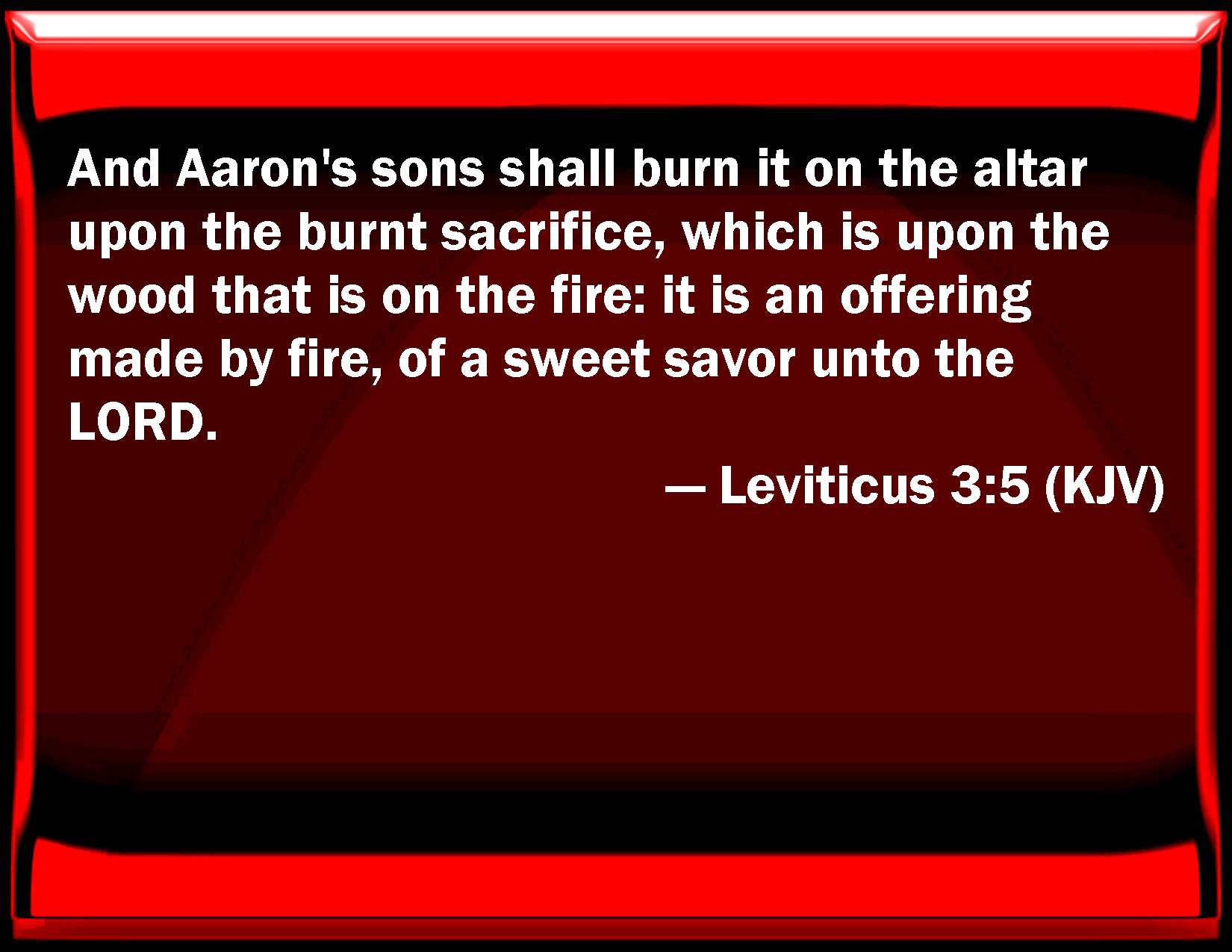 Bible Verse Slide Leviticus 3:5 And Aaron's sons shall burn it on the altar on the burnt sacrifice, which is on the wood that is on the fire: it is an offering made by fire, of a sweet smell to the LORD. KJV: And Aaron's sons shall burn it on the altar upon the burnt sacrifice, which is upon the wood that is on the fire: it is an offering made by fire, of a sweet savour unto the LORD. DRB: And they shall burn them upon the altar, for a holocaust, putting fire under the wood: for an oblation of most sweet savour to the Lord. DBT: and Aaron's sons shall burn it on the altar upon the burnt-offering which lieth on the wood that is upon the fire: it is an offering by fire to Jehovah of a sweet odour. ERV: And Aaron's sons shall burn it on the altar upon the burnt offering, which is upon the wood that is on the fire: it is an offering made by fire, of a sweet savour unto the LORD. WBT: And Aaron's sons shall burn it on the altar, upon the burnt-sacrifice which is upon the wood that is on the fire: it is an offering made by fire, of a sweet savor to the LORD. WEB: Aaron's sons shall burn it on the altar on the burnt offering, which is on the wood that is on the fire: it is an offering made by fire, of a pleasant aroma to Yahweh. YLT: and sons of Aaron have made it a perfume on the altar, on the burnt-offering which is on the wood, which is on the fire — a fire-offering of sweet fragrance to Jehovah.Links Leviticus 3:5 NIV • Leviticus 3:5 NLT • Leviticus 3:5 ESV • Leviticus 3:5 NASB • Leviticus 3:5 KJV • Leviticus 3:5 Interlinear • Leviticus 3:5 Commentaries • Leviticus 3:5 Parallel Texts • Leviticus 3:5 Bible Apps • Leviticus 3:5 Parallel • Bible Hub |