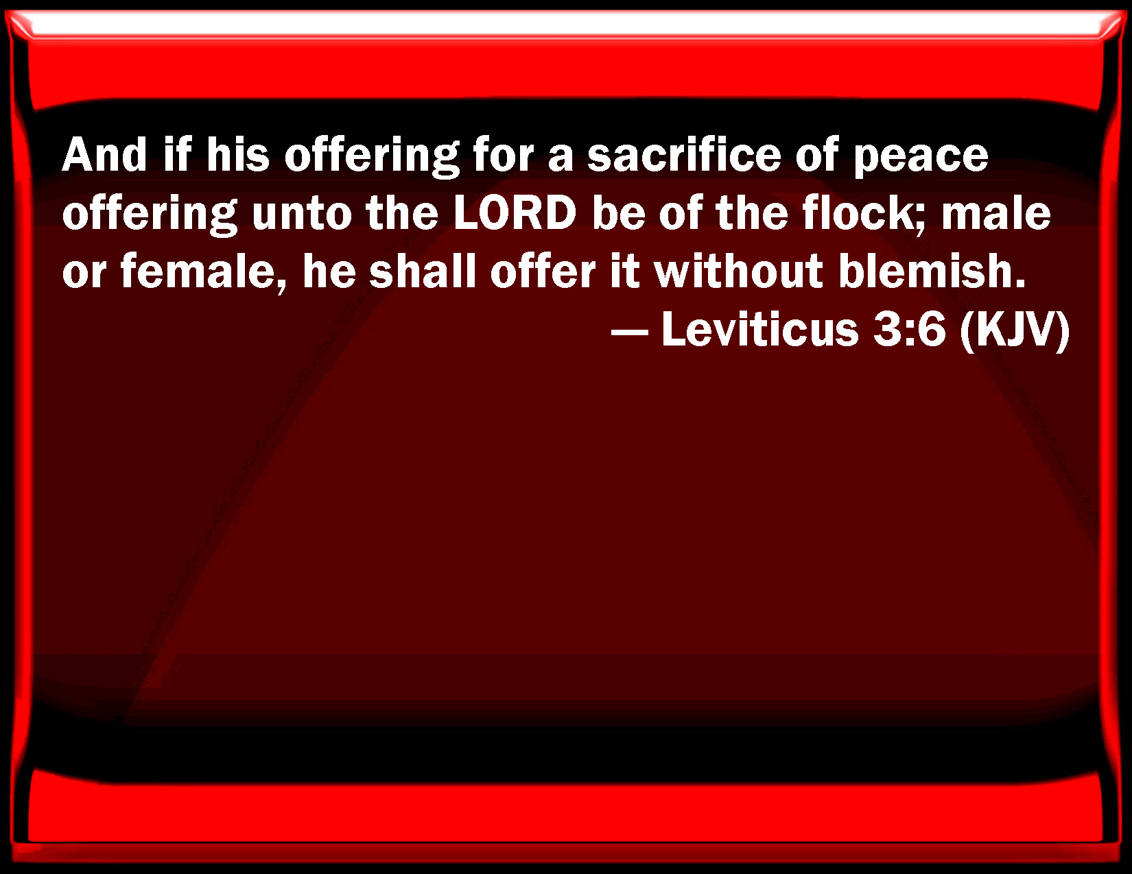 Bible Verse Slide Leviticus 3:6 And if his offering for a sacrifice of peace offering to the LORD be of the flock; male or female, he shall offer it without blemish. KJV: And if his offering for a sacrifice of peace offering unto the LORD be of the flock; male or female, he shall offer it without blemish. DRB: But if his oblation and the sacrifice of peace offering be of the flock, whether he offer male or female, they shall be without blemish. DBT: And if his offering for a sacrifice of peace-offering to Jehovah be of small cattle, male or female, he shall present it without blemish. ERV: And if his oblation for a sacrifice of peace offerings unto the LORD be of the flock; male or female, he shall offer it without blemish. WBT: And if his offering for a sacrifice of peace-offering to the LORD shall be of the flock, male or female; he shall offer it without blemish. WEB: "'If his offering for a sacrifice of peace offerings to Yahweh is from the flock; male or female, he shall offer it without blemish. YLT: And if his offering is out of the flock for a sacrifice of peace-offerings to Jehovah, male or female, a perfect one he doth bring near;Links Leviticus 3:6 NIV • Leviticus 3:6 NLT • Leviticus 3:6 ESV • Leviticus 3:6 NASB • Leviticus 3:6 KJV • Leviticus 3:6 Interlinear • Leviticus 3:6 Commentaries • Leviticus 3:6 Parallel Texts • Leviticus 3:6 Bible Apps • Leviticus 3:6 Parallel • Bible Hub |
