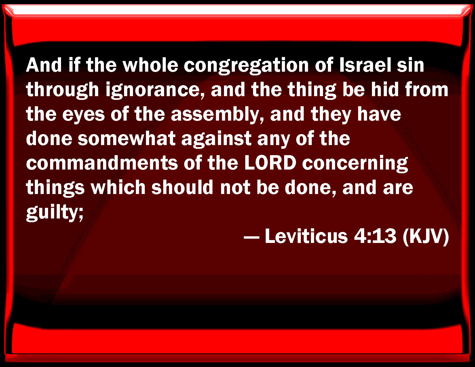 Bible Verse Slide Leviticus 4:13 And if the whole congregation of Israel sin through ignorance, and the thing be hid from the eyes of the assembly, and they have done somewhat against any of the commandments of the LORD concerning things which should not be done, and are guilty; KJV: And if the whole congregation of Israel sin through ignorance, and the thing be hid from the eyes of the assembly, and they have done somewhat against any of the commandments of the LORD concerning things which should not be done, and are guilty; DRB: And if all the multitude of Israel shall be ignorant, and through ignorance shall do that which is against the commandment of the Lord, DBT: And if the whole assembly of Israel sin inadvertently, and the thing be hid from the eyes of the congregation, and they do somewhat against any of all the commandments of Jehovah in things which should not be done, and are guilty; ERV: And if the whole congregation of Israel shall err, and the thing be hid from the eyes of the assembly, and they have done any of the things which the LORD hath commanded not to be done, and are guilty; WBT: And if the whole congregation of Israel shall sin through ignorance, and the thing be hid from the eyes of the assembly, and they have done somewhat against any of the commandments of the LORD concerning things which should not be done, and are guilty; WEB: "'If the whole congregation of Israel sins, and the thing is hidden from the eyes of the assembly, and they have done any of the things which Yahweh has commanded not to be done, and are guilty; YLT: And if the whole company of Israel err ignorantly, and the thing hath been hidden from the eyes of the assembly, and they have done something against one of all the commands of Jehovah concerning things which are not to be done, and have been guilty;Links Leviticus 4:13 NIV • Leviticus 4:13 NLT • Leviticus 4:13 ESV • Leviticus 4:13 NASB • Leviticus 4:13 KJV • Leviticus 4:13 Interlinear • Leviticus 4:13 Commentaries • Leviticus 4:13 Parallel Texts • Leviticus 4:13 Bible Apps • Leviticus 4:13 Parallel • Bible Hub |