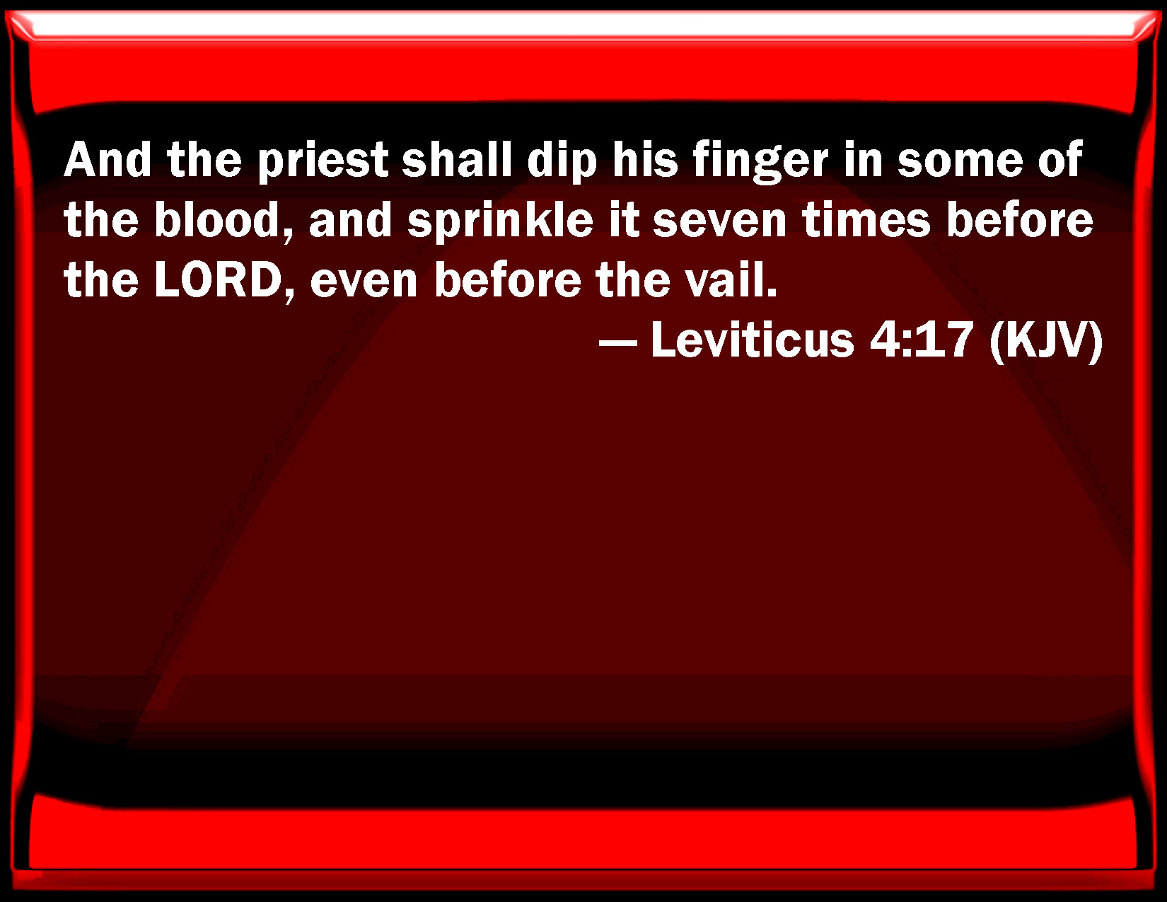 Bible Verse Slide Leviticus 4:17 And the priest shall dip his finger in some of the blood, and sprinkle it seven times before the LORD, even before the veil. KJV: And the priest shall dip his finger in some of the blood, and sprinkle it seven times before the LORD, even before the vail. DRB: And shall dip his finger in it and sprinkle it seven times before the veil. DBT: and the priest shall dip his finger in the blood, and sprinkle it seven times before Jehovah, before the veil; ERV: and the priest shall dip his finger in the blood, and sprinkle it seven times before the LORD, before the veil. WBT: And the priest shall dip his finger in some of the blood, and sprinkle it seven times before the LORD, even before the vail. WEB: and the priest shall dip his finger in the blood, and sprinkle it seven times before Yahweh, before the veil. YLT: and the priest hath dipped his finger in the blood, and hath sprinkled seven times before Jehovah at the front of the vail,Links Leviticus 4:17 NIV • Leviticus 4:17 NLT • Leviticus 4:17 ESV • Leviticus 4:17 NASB • Leviticus 4:17 KJV • Leviticus 4:17 Interlinear • Leviticus 4:17 Commentaries • Leviticus 4:17 Parallel Texts • Leviticus 4:17 Bible Apps • Leviticus 4:17 Parallel • Bible Hub |