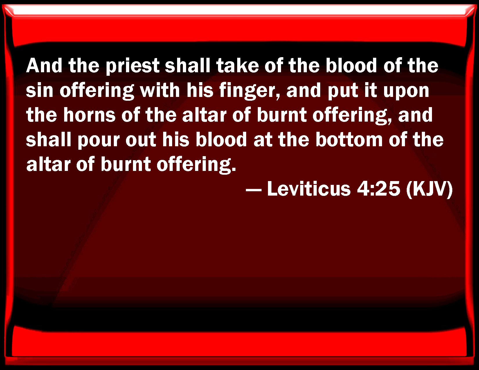 Bible Verse Slide Leviticus 4:25 And the priest shall take of the blood of the sin offering with his finger, and put it on the horns of the altar of burnt offering, and shall pour out his blood at the bottom of the altar of burnt offering. KJV: And the priest shall take of the blood of the sin offering with his finger, and put it upon the horns of the altar of burnt offering, and shall pour out his blood at the bottom of the altar of burnt offering. DRB: The priest shall dip his finger in the blood of the victim for sin, touching therewith the horns of the altar of holocaust, and pouring out the rest at the foot thereof. DBT: And the priest shall take of the blood of the sin-offering with his finger, and put it on the horns of the altar of burnt-offering, and shall pour out its blood at the bottom of the altar of burnt-offering. ERV: And the priest shall take of the blood of the sin offering with his finger, and put it upon the horns of the altar of burnt offering, and the blood thereof shall he pour out at the base of the altar of burnt offering. WBT: And the priest shall take of the blood of the sin-offering with his finger, and put it upon the horns of the altar of burnt-offering, and shall pour out his blood at the bottom of the altar of burnt-offering. WEB: The priest shall take some of the blood of the sin offering with his finger, and put it on the horns of the altar of burnt offering. He shall pour out the rest of its blood at the base of the altar of burnt offering. YLT: 'And the priest hath taken of the blood of the sin-offering with his finger, and hath put on the horns of the altar of the burnt-offering, and its blood he doth pour out at the foundation of the altar of the burnt-offering,Links Leviticus 4:25 NIV • Leviticus 4:25 NLT • Leviticus 4:25 ESV • Leviticus 4:25 NASB • Leviticus 4:25 KJV • Leviticus 4:25 Interlinear • Leviticus 4:25 Commentaries • Leviticus 4:25 Parallel Texts • Leviticus 4:25 Bible Apps • Leviticus 4:25 Parallel • Bible Hub |