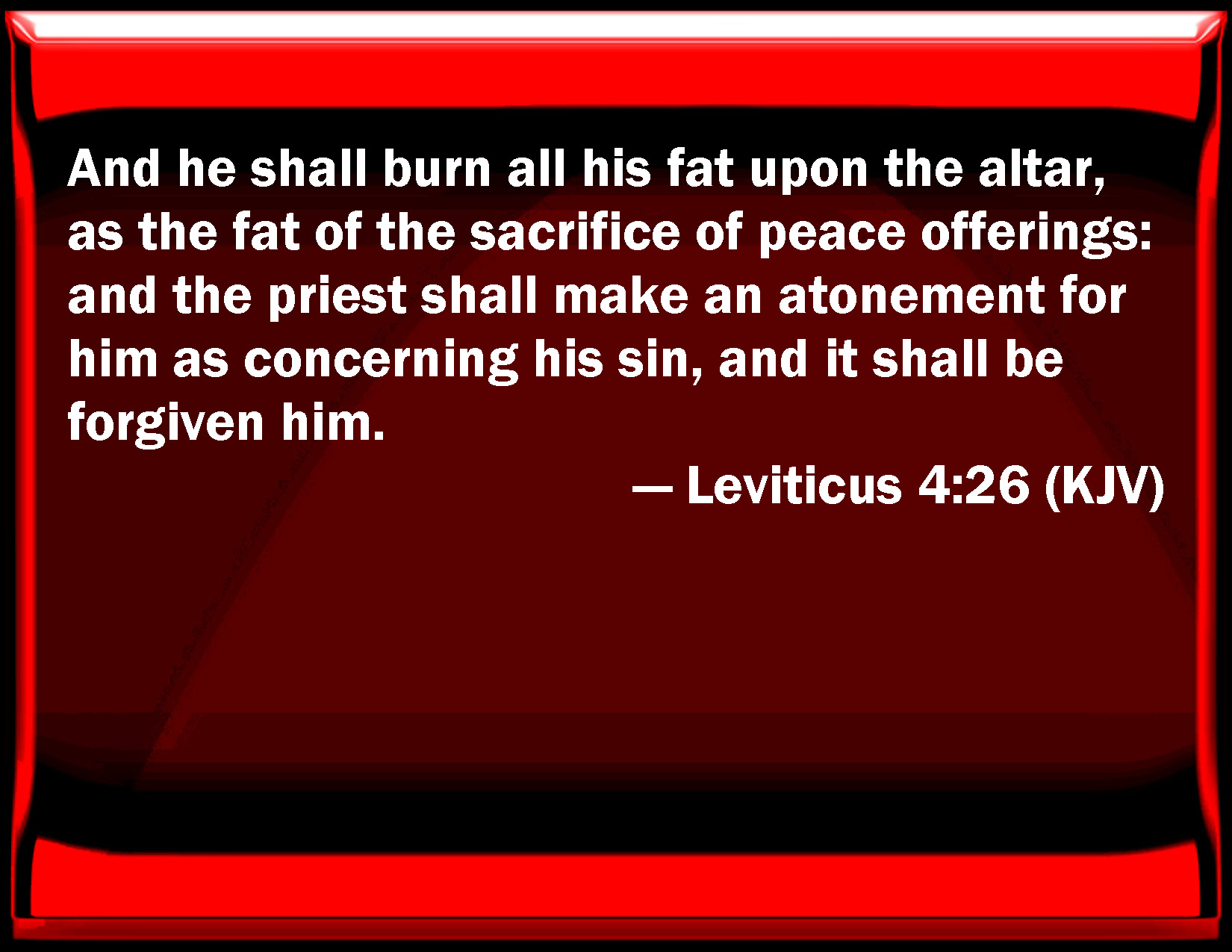 Leviticus 4:26 And he shall burn all his fat on the altar, as the fat of the sacrifice of peace offerings: and the priest shall make an atonement for him as concerning his sin, and it shall be forgiven him.