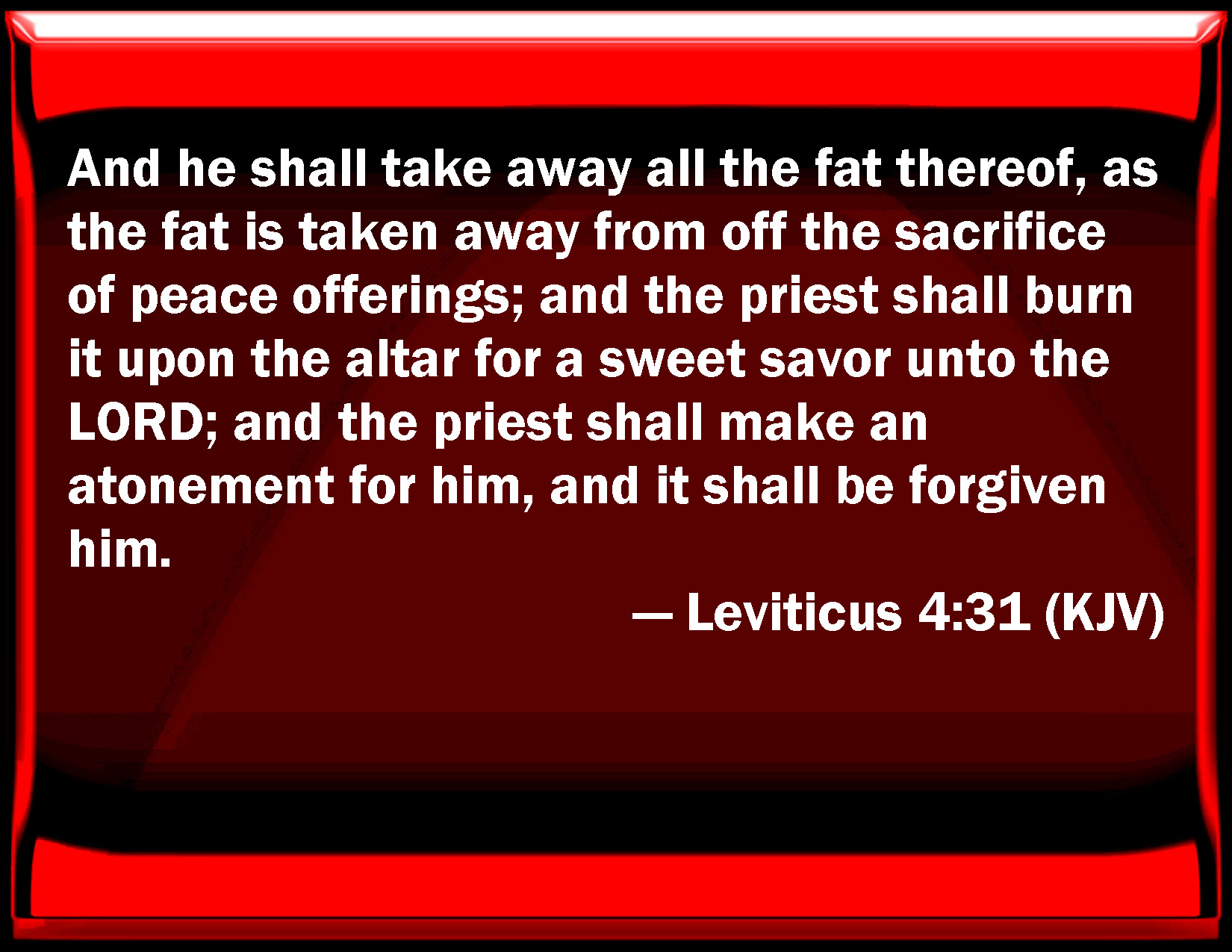 Leviticus 4:31 And he shall take away all the fat thereof, as the fat is taken away from off the sacrifice of peace offerings; and the priest shall burn it on the altar for a sweet smell to the LORD; and the priest shall make an atonement for him, and it shall be forgiven him.