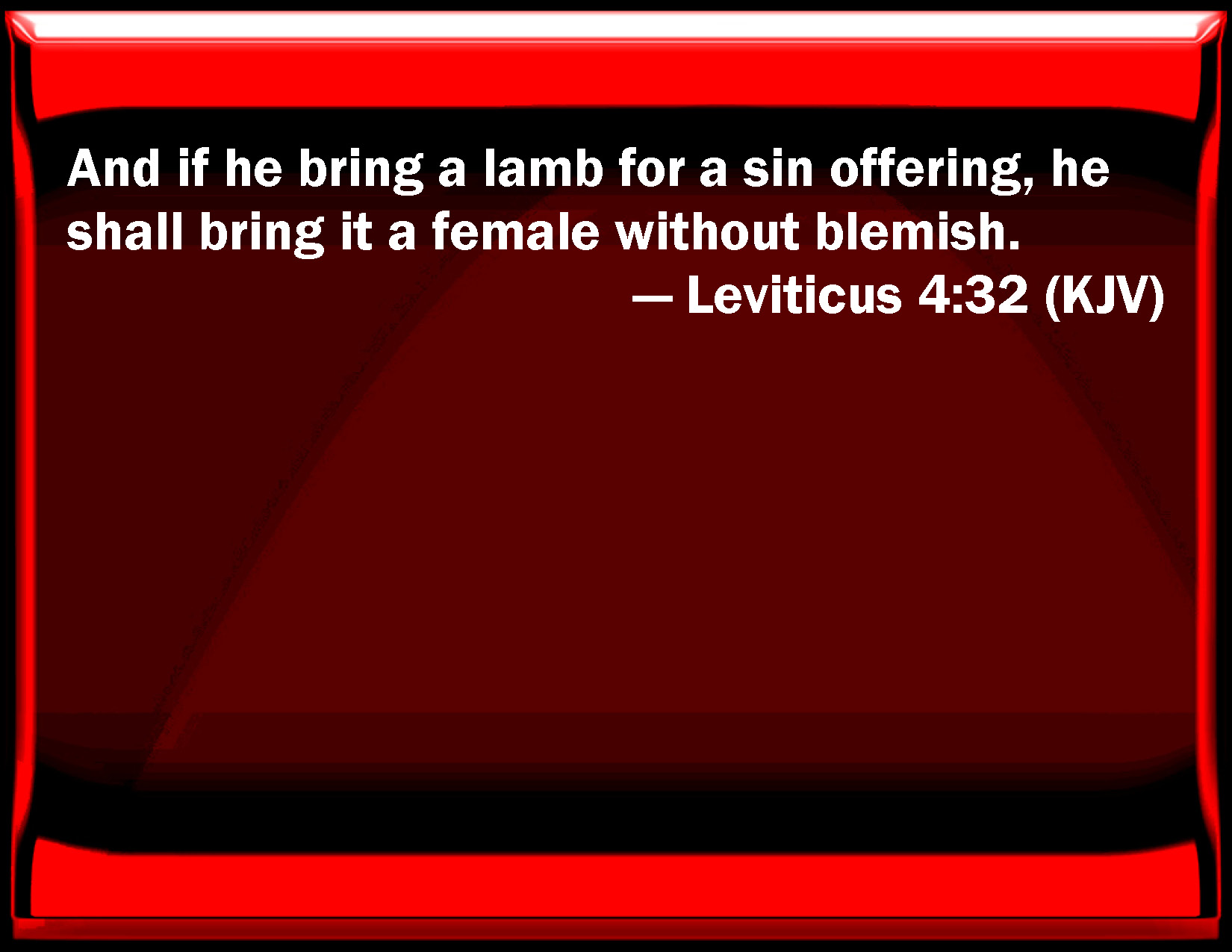 Bible Verse Slide Leviticus 4:32 And if he bring a lamb for a sin offering, he shall bring it a female without blemish. KJV: And if he bring a lamb for a sin offering, he shall bring it a female without blemish. DRB: But if he offer of the flock a victim for his sin, to wit, an ewe without blemish: DBT: And if he bring a sheep for his offering for sin, a female without blemish shall he bring it. ERV: And if he bring a lamb as his oblation for a sin offering, he shall bring it a female without blemish. WBT: And if he shall bring a lamb for a sin-offering, he shall bring it a female without blemish. WEB: "'If he brings a lamb as his offering for a sin offering, he shall bring a female without blemish. YLT: And if he bring in a sheep for his offering, for a sin-offering, a female, a perfect one, he doth bring in,Links Leviticus 4:32 NIV • Leviticus 4:32 NLT • Leviticus 4:32 ESV • Leviticus 4:32 NASB • Leviticus 4:32 KJV • Leviticus 4:32 Interlinear • Leviticus 4:32 Commentaries • Leviticus 4:32 Parallel Texts • Leviticus 4:32 Bible Apps • Leviticus 4:32 Parallel • Bible Hub |