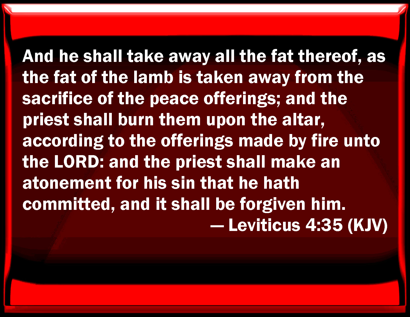 Leviticus 4:35 And he shall take away all the fat thereof, as the fat of the lamb is taken away from the sacrifice of the peace offerings; and the priest shall burn them on the altar, according to the offerings made by fire to the LORD: and the priest shall make an atonement for his sin that he has committed, and it shall be forgiven him.