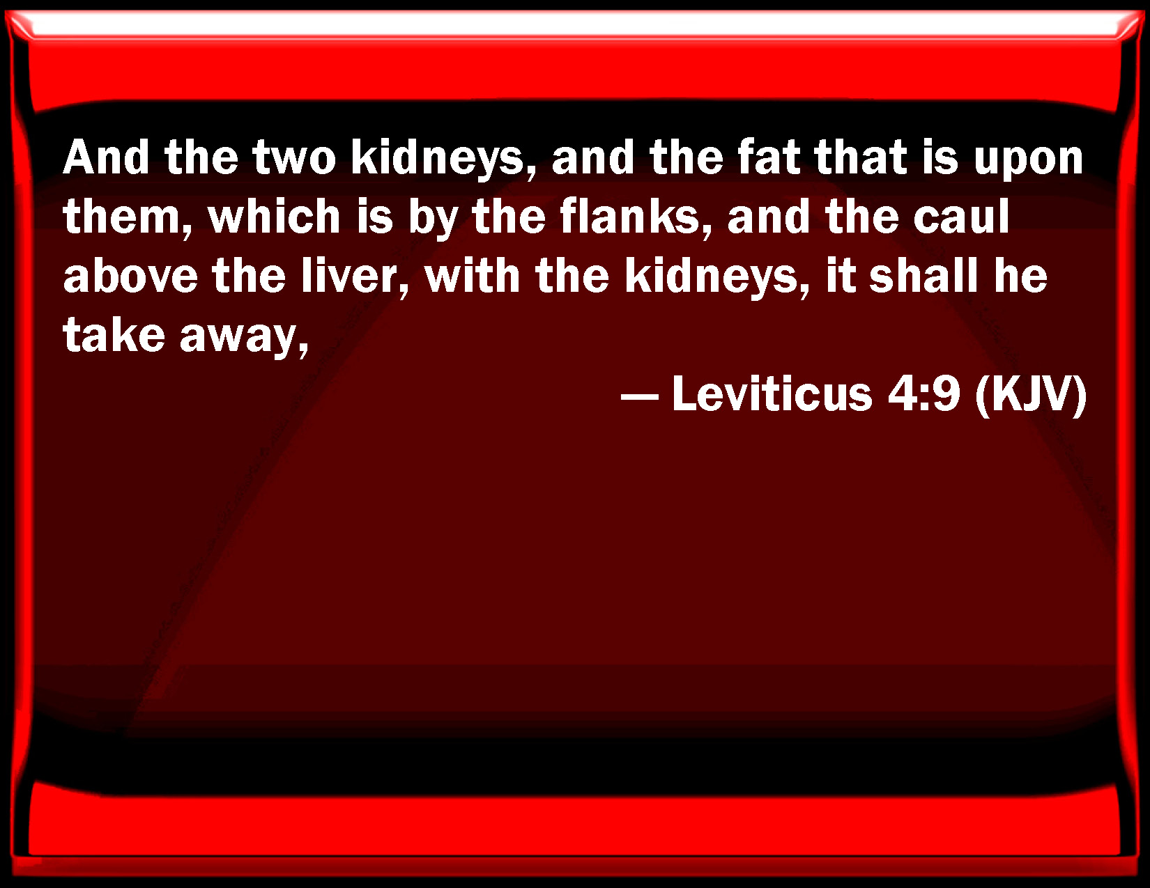 Bible Verse Slide Leviticus 4:9 And the two kidneys, and the fat that is on them, which is by the flanks, and the lobe above the liver, with the kidneys, it shall he take away, KJV: And the two kidneys, and the fat that is upon them, which is by the flanks, and the caul above the liver, with the kidneys, it shall he take away, DRB: The two little kidneys, and the caul that is upon them, which is by the hanks, and the fat of the liver with the little kidneys, DBT: and the two kidneys, and the fat that is on them, which is by the flanks, and the net above the liver which he shall take away as far as the kidneys, ERV: and the two kidneys, and the fat that is upon them, which is by the loins, and the caul upon the liver, with the kidneys, shall he take away, WBT: And the two kidneys, and the fat that is upon them, which is by the flanks, and the caul above the liver, with the kidneys, that shall he take away, WEB: and the two kidneys, and the fat that is on them, which is by the loins, and the cover on the liver, with the kidneys, he shall take away, YLT: and the two kidneys, and the fat which is on them, which is on the flanks, and the redundance above the liver, (beside the kidneys he doth turn it aside),Links Leviticus 4:9 NIV • Leviticus 4:9 NLT • Leviticus 4:9 ESV • Leviticus 4:9 NASB • Leviticus 4:9 KJV • Leviticus 4:9 Interlinear • Leviticus 4:9 Commentaries • Leviticus 4:9 Parallel Texts • Leviticus 4:9 Bible Apps • Leviticus 4:9 Parallel • Bible Hub |