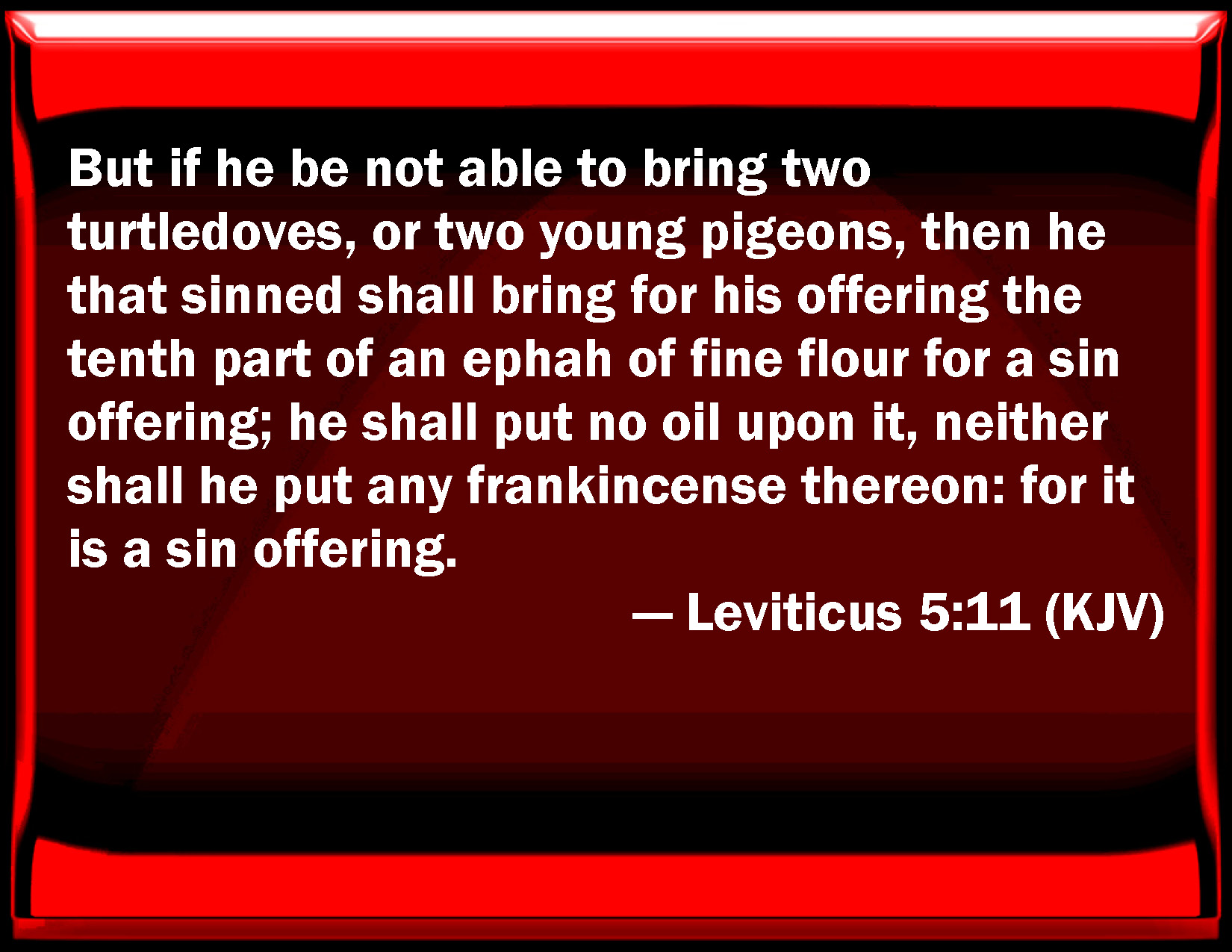 Bible Verse Slide Leviticus 5:11 But if he be not able to bring two turtledoves, or two young pigeons, then he that sinned shall bring for his offering the tenth part of an ephah of fine flour for a sin offering; he shall put no oil on it, neither shall he put any frankincense thereon: for it is a sin offering. KJV: But if he be not able to bring two turtledoves, or two young pigeons, then he that sinned shall bring for his offering the tenth part of an ephah of fine flour for a sin offering; he shall put no oil upon it, neither shall he put any frankincense thereon: for it is a sin offering. DRB: And if his hand be not able to offer two turtles, or two young pigeons, he shall offer for his sin the tenth part of an ephi of flour. He shall not put oil upon it, nor put any frankincense thereon, because it is for sin: DBT: But if his hand cannot attain to two turtle-doves, or two young pigeons, then he that sinned shall bring for his offering the tenth part of an ephah of fine flour for a sin-offering: he shall put no oil on it, neither shall he put frankincense thereon; for it is a sin-offering. ERV: But if his means suffice not for two turtledoves, or two young pigeons, then he shall bring his oblation for that wherein he hath sinned, the tenth part of an ephah of fine flour for a sin offering; he shall put no oil upon it, neither shall he put any frankincense thereon: for it is a sin offering. WBT: But if he shall not be able to bring two turtle-doves, or two young pigeons; then he that sinned shall bring for his offering the tenth part of an ephah of fine flour for a sin-offering; he shall put no oil upon it, neither shall he put any frankincense upon it: for it is a sin-offering. WEB: "'But if he can't afford two turtledoves, or two young pigeons, then he shall bring his offering for that in which he has sinned, the tenth part of an ephah of fine flour for a sin offering. He shall put no oil on it, neither shall he put any frankincense on it, for it is a sin offering. YLT: And if his hand reach not to two turtle-doves, or to two young pigeons, then he hath brought in his offering — he who hath sinned — a tenth of an ephah of flour for a sin-offering; he putteth no oil on it, nor doth he put on it frankincense, for it is a sin-offering,Links Leviticus 5:11 NIV • Leviticus 5:11 NLT • Leviticus 5:11 ESV • Leviticus 5:11 NASB • Leviticus 5:11 KJV • Leviticus 5:11 Interlinear • Leviticus 5:11 Commentaries • Leviticus 5:11 Parallel Texts • Leviticus 5:11 Bible Apps • Leviticus 5:11 Parallel • Bible Hub |