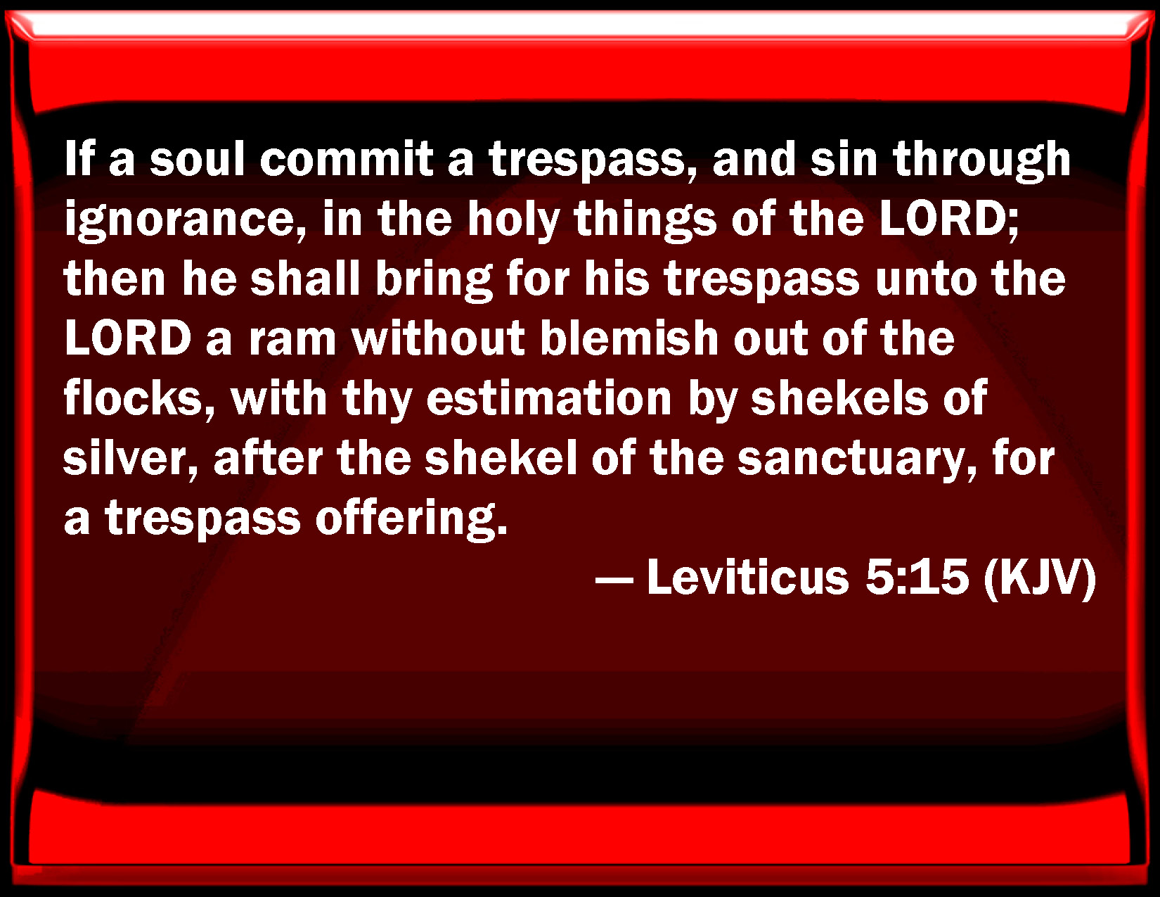 Bible Verse Slide Leviticus 5:15 If a soul commit a trespass, and sin through ignorance, in the holy things of the LORD; then he shall bring for his trespass to the LORD a ram without blemish out of the flocks, with your estimation by shekels of silver, after the shekel of the sanctuary, for a trespass offering. KJV: If a soul commit a trespass, and sin through ignorance, in the holy things of the LORD; then he shall bring for his trespass unto the LORD a ram without blemish out of the flocks, with thy estimation by shekels of silver, after the shekel of the sanctuary, for a trespass offering: DRB: If any one shall sin through mistake, transgressing the ceremonies in those things that are sacrificed to the Lord, he shall offer for his offence a ram without blemish out of the flocks, that may be bought for two sicles, according to the weight of the sanctuary: DBT: If any one act unfaithfully and sin through inadvertence in the holy things of Jehovah, then he shall bring his trespass-offering to Jehovah, a ram without blemish out of the small cattle, according to thy valuation by shekels of silver, according to the shekel of the sanctuary, for a trespass-offering. ERV: If any one commit a trespass, and sin unwittingly, in the holy things of the LORD; then he shall bring his guilt offering unto the LORD, a ram without blemish out of the flock, according to thy estimation in silver by shekels, after the shekel of the sanctuary, for a guilt offering: WBT: If a soul shall commit a trespass, and sin through ignorance, in the holy things of the LORD; then he shall bring for his trespass to the LORD a ram without blemish out of the flocks, with thy estimation by shekels of silver, after the shekel of the sanctuary, for a trespass-offering: WEB: "If anyone commits a trespass, and sins unwittingly, in the holy things of Yahweh; then he shall bring his trespass offering to Yahweh, a ram without blemish from the flock, according to your estimation in silver by shekels, after the shekel of the sanctuary, for a trespass offering. YLT: When a person committeth a trespass, and hath sinned through ignorance against the holy things of Jehovah, then he hath brought in his guilt-offering to Jehovah, a ram, a perfect one, out of the flock, at thy valuation in silver — shekels by the shekel of the sanctuary — for a guilt-offering.Links Leviticus 5:15 NIV • Leviticus 5:15 NLT • Leviticus 5:15 ESV • Leviticus 5:15 NASB • Leviticus 5:15 KJV • Leviticus 5:15 Interlinear • Leviticus 5:15 Commentaries • Leviticus 5:15 Parallel Texts • Leviticus 5:15 Bible Apps • Leviticus 5:15 Parallel • Bible Hub |
