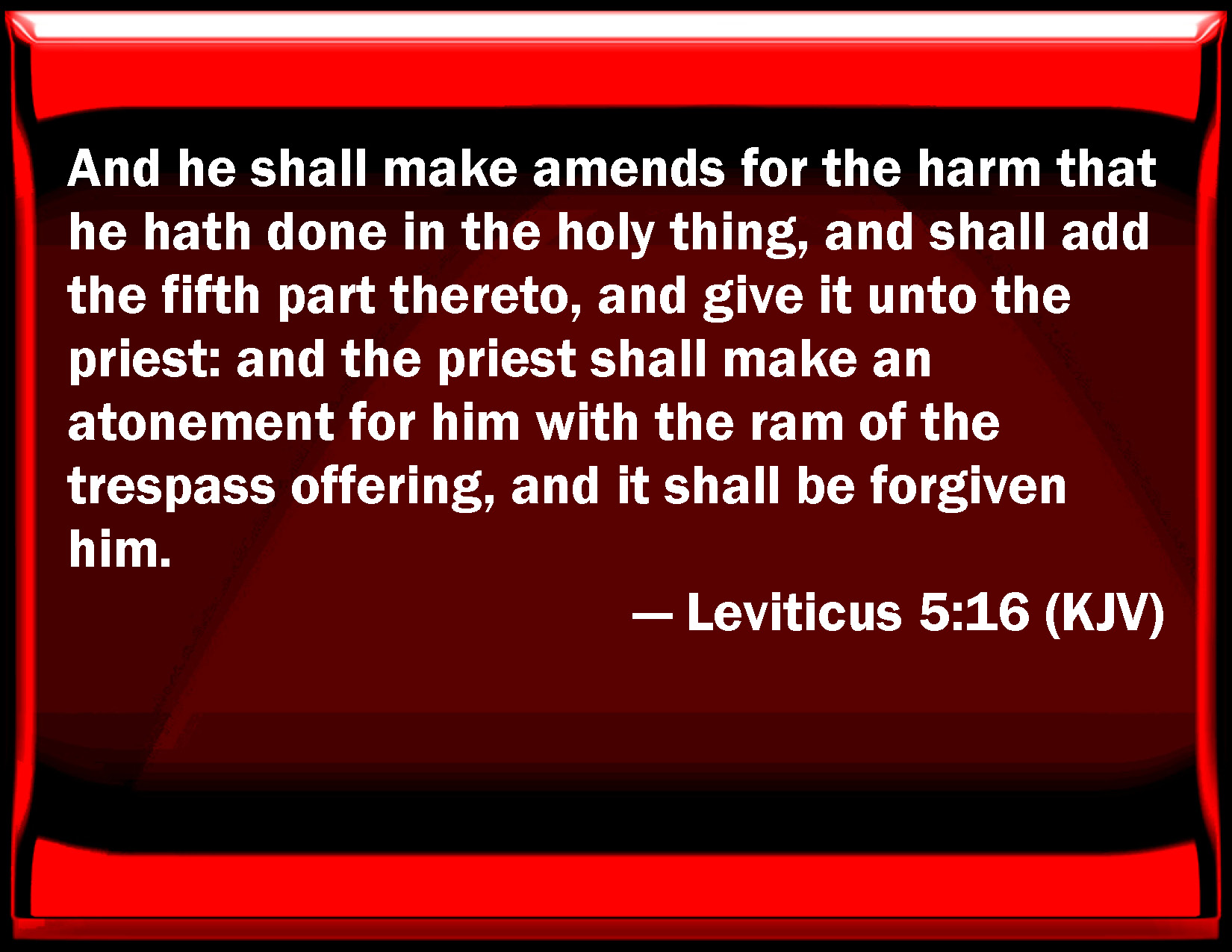 Bible Verse Slide Leviticus 5:16 And he shall make amends for the harm that he has done in the holy thing, and shall add the fifth part thereto, and give it to the priest: and the priest shall make an atonement for him with the ram of the trespass offering, and it shall be forgiven him. KJV: And he shall make amends for the harm that he hath done in the holy thing, and shall add the fifth part thereto, and give it unto the priest: and the priest shall make an atonement for him with the ram of the trespass offering, and it shall be forgiven him. DRB: And he shall make good the damage itself which he hath done, and shall add the fifth part besides, delivering it to the priest, who shall pray for him, offering the ram, and it shall be forgiven him. DBT: And he shall make restitution for the wrong that he hath done in the holy things, and shall add the fifth part thereto, and shall give it unto the priest; and the priest shall make atonement for him with the ram of the trespass-offering, and it shall be forgiven him. ERV: and he shall make restitution for that which he hath done amiss in the holy thing, and shall add the fifth part thereto, and give it unto the priest: and the priest shall make atonement for him with the ram of the guilt offering, and he shall be forgiven. WBT: And he shall make amends for the harm that he hath done in the holy thing, and shall add to it the fifth part, and give it to the priest: and the priest shall make an atonement for him with the ram of the trespass-offering, and it shall be forgiven him. WEB: He shall make restitution for that which he has done wrong in the holy thing, and shall add a fifth part to it, and give it to the priest; and the priest shall make atonement for him with the ram of the trespass offering, and he will be forgiven. YLT: 'And that which he hath sinned against the holy thing he repayeth, and its fifth is adding to it, and hath given it to the priest, and the priest maketh atonement for him with the ram of the guilt-offering, and it hath been forgiven him.Links Leviticus 5:16 NIV • Leviticus 5:16 NLT • Leviticus 5:16 ESV • Leviticus 5:16 NASB • Leviticus 5:16 KJV • Leviticus 5:16 Interlinear • Leviticus 5:16 Commentaries • Leviticus 5:16 Parallel Texts • Leviticus 5:16 Bible Apps • Leviticus 5:16 Parallel • Bible Hub |
