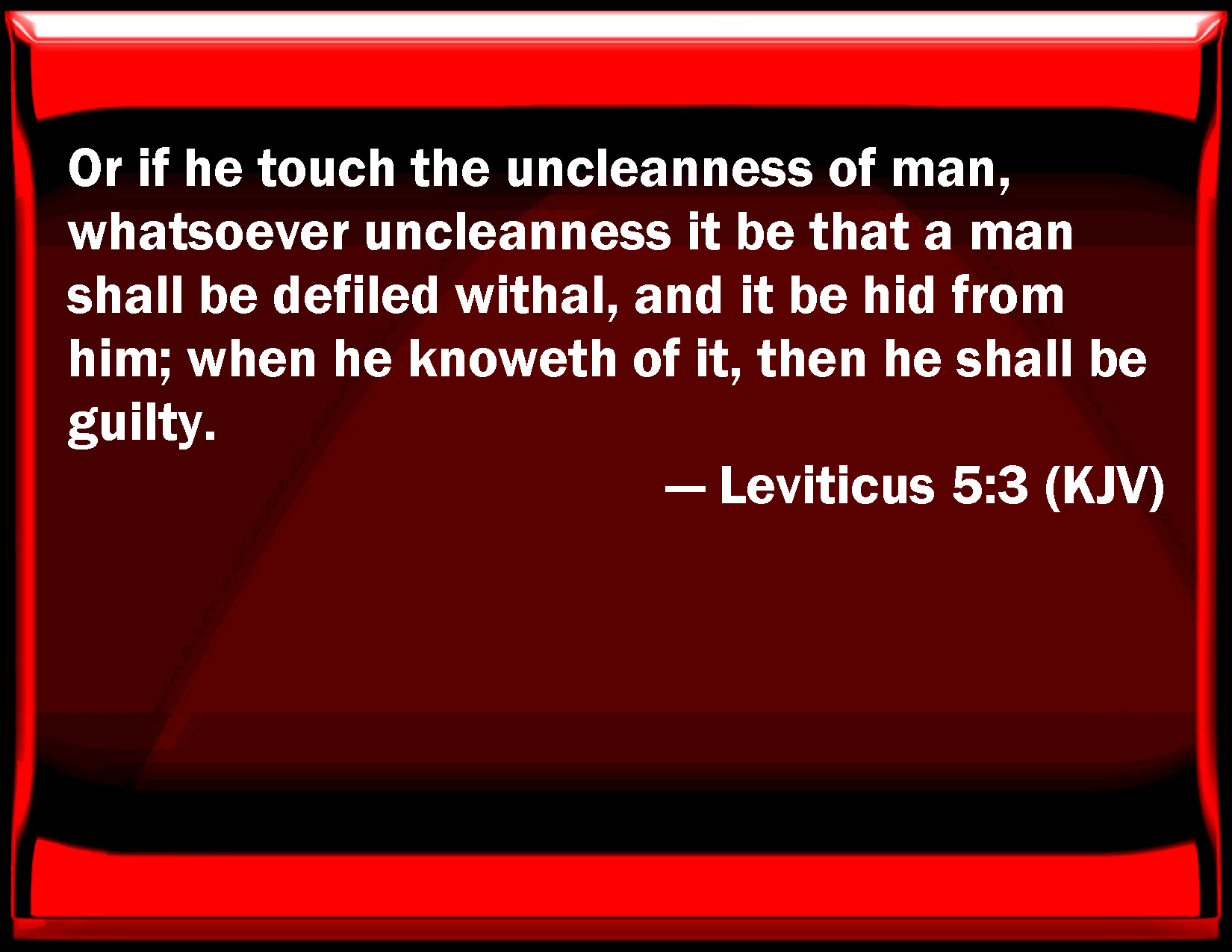 Bible Verse Slide Leviticus 5:3 Or if he touch the uncleanness of man, whatever uncleanness it be that a man shall be defiled with, and it be hid from him; when he knows of it, then he shall be guilty. KJV: Or if he touch the uncleanness of man, whatsoever uncleanness it be that a man shall be defiled withal, and it be hid from him; when he knoweth of it, then he shall be guilty. DRB: And if he touch any thing of the uncleanness of man, according to any uncleanness wherewith he is wont to be defiled, and having forgotten it, come afterwards to know it, he shall be guilty of an offence. DBT: or if he touch the uncleanness of man, any uncleanness of him by which he is defiled, and it be hid from him, when he knoweth it, then he is guilty. ERV: or if he touch the uncleanness of man, whatsoever his uncleanness be wherewith he is unclean, and it be hid from him; when he knoweth of it, then he shall be guilty: WBT: Or if he shall touch the uncleanness of man, whatever uncleanness it may be that a man shall be defiled with, and it be hid from him; when he knoweth of it, then he shall be guilty. WEB: "'Or if he touches the uncleanness of man, whatever his uncleanness is with which he is unclean, and it is hidden from him; when he knows of it, then he shall be guilty. YLT: 'Or when he cometh against uncleanness of man, even any of his uncleanness whereby he is unclean, and it hath been hidden from him, and he hath known, and hath been guilty:Links Leviticus 5:3 NIV • Leviticus 5:3 NLT • Leviticus 5:3 ESV • Leviticus 5:3 NASB • Leviticus 5:3 KJV • Leviticus 5:3 Interlinear • Leviticus 5:3 Commentaries • Leviticus 5:3 Parallel Texts • Leviticus 5:3 Bible Apps • Leviticus 5:3 Parallel • Bible Hub |