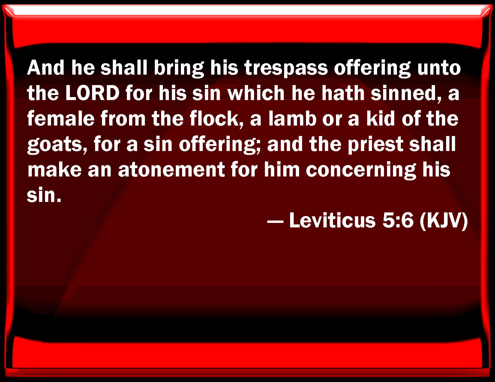 Bible Verse Slide Leviticus 5:6 And he shall bring his trespass offering to the LORD for his sin which he has sinned, a female from the flock, a lamb or a kid of the goats, for a sin offering; and the priest shall make an atonement for him concerning his sin. KJV: And he shall bring his trespass offering unto the LORD for his sin which he hath sinned, a female from the flock, a lamb or a kid of the goats, for a sin offering; and the priest shall make an atonement for him concerning his sin. DRB: And offer of the flocks an ewe lamb, or a she goat, and the priest shall pray for him and for his sin: DBT: and he shall bring his trespass-offering to Jehovah for his sin which he hath sinned, a female from the small cattle, a sheep or doe goat, for a sin-offering; and the priest shall make atonement for him to cleanse him from his sin. ERV: and he shall bring his guilt offering unto the LORD for his sin which he hath sinned, a female from the flock, a lamb or a goat, for a sin offering; and the priest shall make atonement for him as concerning his sin. WBT: And he shall bring his trespass-offering to the LORD for his sin which he hath sinned, a female from the flock, a lamb or a kid of the goats, for a sin-offering; and the priest shall make an atonement for him concerning his sin. WEB: and he shall bring his trespass offering to Yahweh for his sin which he has sinned, a female from the flock, a lamb or a goat, for a sin offering; and the priest shall make atonement for him concerning his sin. YLT: and hath brought in his guilt-offering to Jehovah for his sin which he hath sinned, a female out of the flock, a lamb, or a kid of the goats, for a sin-offering, and the priest hath made atonement for him, because of his sin.Links Leviticus 5:6 NIV • Leviticus 5:6 NLT • Leviticus 5:6 ESV • Leviticus 5:6 NASB • Leviticus 5:6 KJV • Leviticus 5:6 Interlinear • Leviticus 5:6 Commentaries • Leviticus 5:6 Parallel Texts • Leviticus 5:6 Bible Apps • Leviticus 5:6 Parallel • Bible Hub |