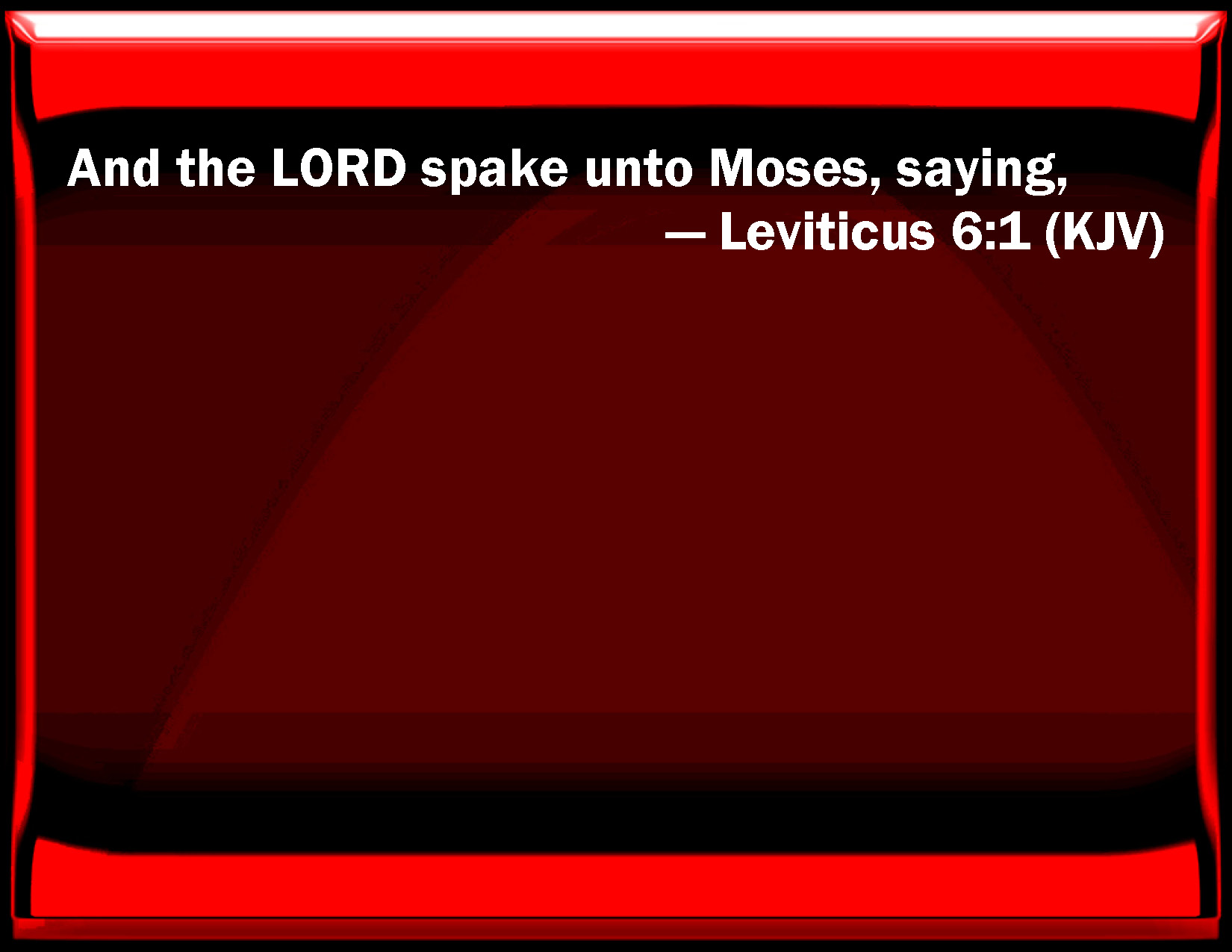 Bible Verse Slide Leviticus 6:1 And the LORD spoke to Moses, saying, KJV: And the LORD spake unto Moses, saying, DRB: The Lord spoke to Moses, saying: DBT: And Jehovah spoke to Moses, saying, ERV: And the LORD spake unto Moses, saying, WBT: And the LORD spoke to Moses, saying, WEB: Yahweh spoke to Moses, saying, YLT: And Jehovah speaketh unto Moses, saying,Links Leviticus 6:1 NIV • Leviticus 6:1 NLT • Leviticus 6:1 ESV • Leviticus 6:1 NASB • Leviticus 6:1 KJV • Leviticus 6:1 Interlinear • Leviticus 6:1 Commentaries • Leviticus 6:1 Parallel Texts • Leviticus 6:1 Bible Apps • Leviticus 6:1 Parallel • Bible Hub |