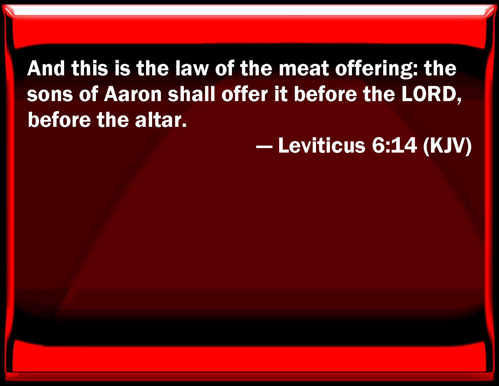 Leviticus 6:14 And this is the law of the meat offering: the sons of Aaron shall offer it before the LORD, before the altar.