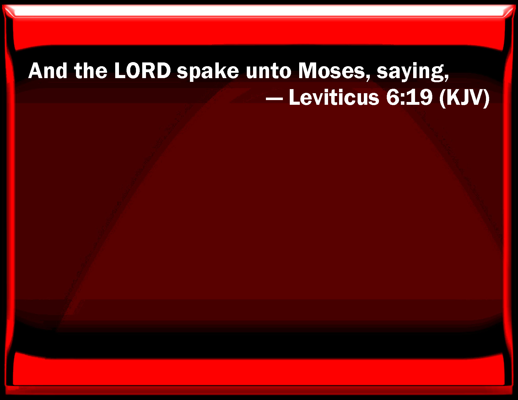 Bible Verse Slide Leviticus 6:19 And the LORD spoke to Moses, saying, KJV: And the LORD spake unto Moses, saying, DRB: And the Lord spoke to Moses, saying: DBT: And Jehovah spoke to Moses, saying, ERV: And the LORD spake unto Moses, saying, WBT: And the LORD spoke to Moses, saying, WEB: Yahweh spoke to Moses, saying, YLT: And Jehovah speaketh unto Moses, saying,Links Leviticus 6:19 NIV • Leviticus 6:19 NLT • Leviticus 6:19 ESV • Leviticus 6:19 NASB • Leviticus 6:19 KJV • Leviticus 6:19 Interlinear • Leviticus 6:19 Commentaries • Leviticus 6:19 Parallel Texts • Leviticus 6:19 Bible Apps • Leviticus 6:19 Parallel • Bible Hub |