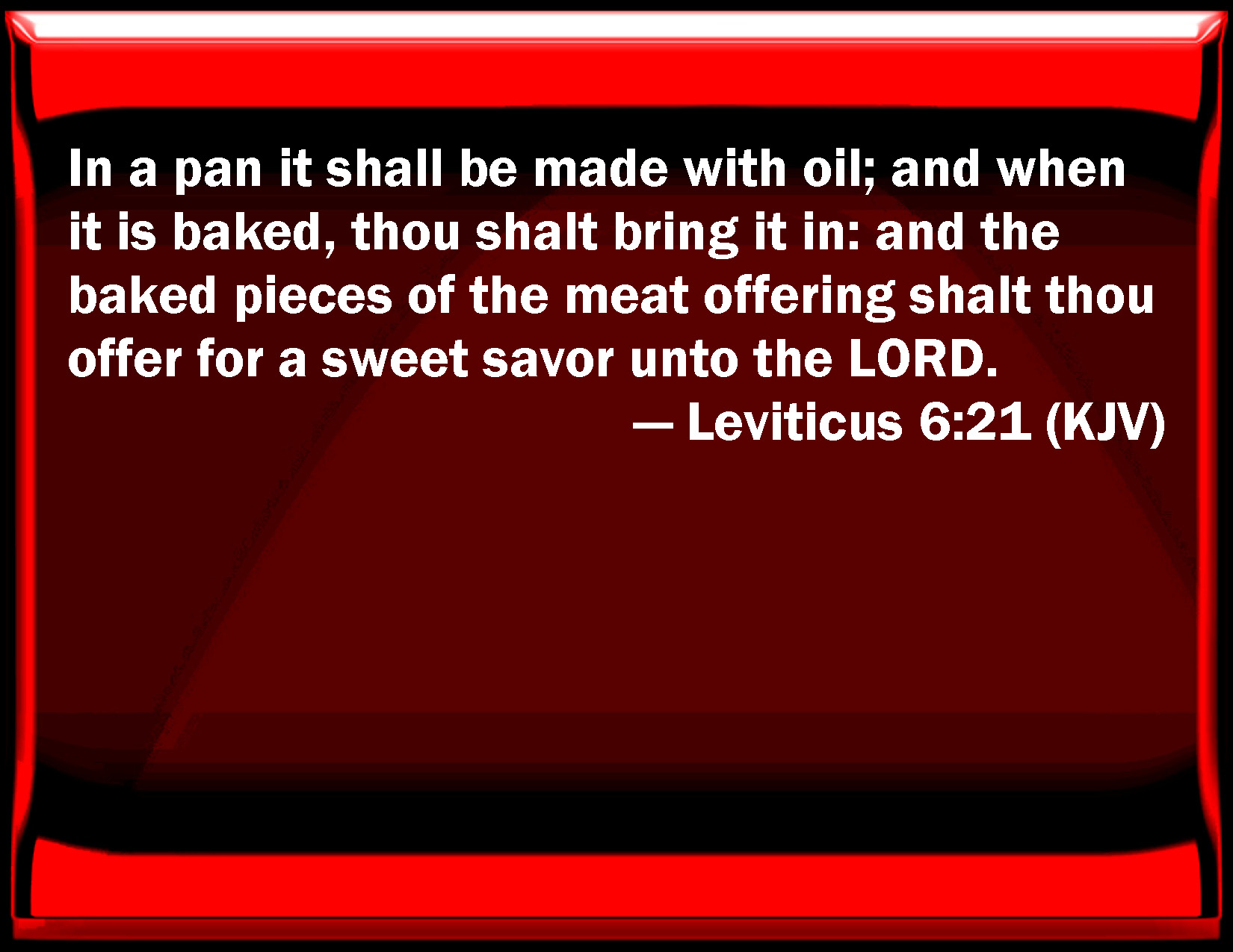 Leviticus 6:21 In a pan it shall be made with oil; and when it is baked, you shall bring it in: and the baked pieces of the meat offering shall you offer for a sweet smell to the LORD.