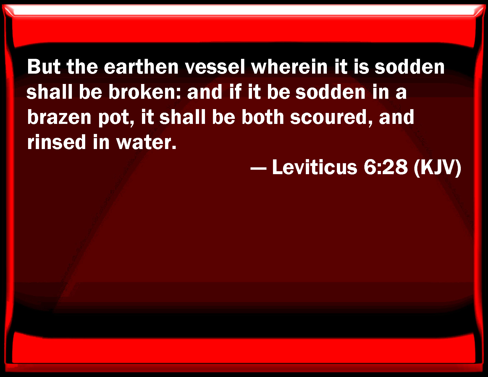 Bible Verse Slide Leviticus 6:28 But the earthen vessel wherein it is sodden shall be broken: and if it be sodden in a brazen pot, it shall be both scoured, and rinsed in water. KJV: But the earthen vessel wherein it is sodden shall be broken: and if it be sodden in a brasen pot, it shall be both scoured, and rinsed in water. DRB: And the earthen vessel, wherein it was sodden, shall be broken, but if the vessel be of brass, it shall be scoured, and washed with water. DBT: And the earthen vessel wherein it hath been sodden shall be broken; and if it have been sodden in a copper pot, it shall be both scoured and rinsed with water. ERV: But the earthen vessel wherein it is sodden shall be broken: and if it be sodden in a brasen vessel, it shall be scoured, and rinsed in water. WBT: But the earthen vessel in which it is boiled shall be broken: and if it shall be boiled in a brazen pot, it shall be both scoured, and rinsed in water. WEB: But the earthen vessel in which it is boiled shall be broken; and if it is boiled in a bronze vessel, it shall be scoured, and rinsed in water. YLT: and an earthen vessel in which it is boiled is broken, and if in a brass vessel it is boiled, then it is scoured and rinsed with water.Links Leviticus 6:28 NIV • Leviticus 6:28 NLT • Leviticus 6:28 ESV • Leviticus 6:28 NASB • Leviticus 6:28 KJV • Leviticus 6:28 Interlinear • Leviticus 6:28 Commentaries • Leviticus 6:28 Parallel Texts • Leviticus 6:28 Bible Apps • Leviticus 6:28 Parallel • Bible Hub |