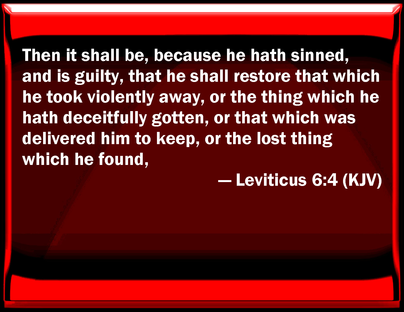Bible Verse Slide Leviticus 6:4 Then it shall be, because he has sinned, and is guilty, that he shall restore that which he took violently away, or the thing which he has deceitfully gotten, or that which was delivered him to keep, or the lost thing which he found, KJV: Then it shall be, because he hath sinned, and is guilty, that he shall restore that which he took violently away, or the thing which he hath deceitfully gotten, or that which was delivered him to keep, or the lost thing which he found, DRB: Being convicted of the offence, he shall restore DBT: then it shall be, if he hath sinned and transgressed, that he shall restore what he robbed or that in which he hath defrauded, or the deposit, or the lost thing which he found, ERV: then it shall be, if he hath sinned, and is guilty, that he shall restore that which he took by robbery, or the thing which he hath gotten by oppression, or the deposit which was committed to him, or the lost thing which he found, WBT: Then it shall be, because he hath sinned, and is guilty, that he shall restore that which he took by force, or the thing which he obtained by deceit, or that which was delivered him to keep, or the lost thing which he found, WEB: then it shall be, if he has sinned, and is guilty, he shall restore that which he took by robbery, or the thing which he has gotten by oppression, or the deposit which was committed to him, or the lost thing which he found, YLT: 'Then it hath been, when he sinneth, and hath been guilty, that he hath returned the plunder which he hath taken violently away, or the thing which he hath got by oppression, or the deposit which hath been deposited with him, or the lost thing which he hath found;Links Leviticus 6:4 NIV • Leviticus 6:4 NLT • Leviticus 6:4 ESV • Leviticus 6:4 NASB • Leviticus 6:4 KJV • Leviticus 6:4 Interlinear • Leviticus 6:4 Commentaries • Leviticus 6:4 Parallel Texts • Leviticus 6:4 Bible Apps • Leviticus 6:4 Parallel • Bible Hub |