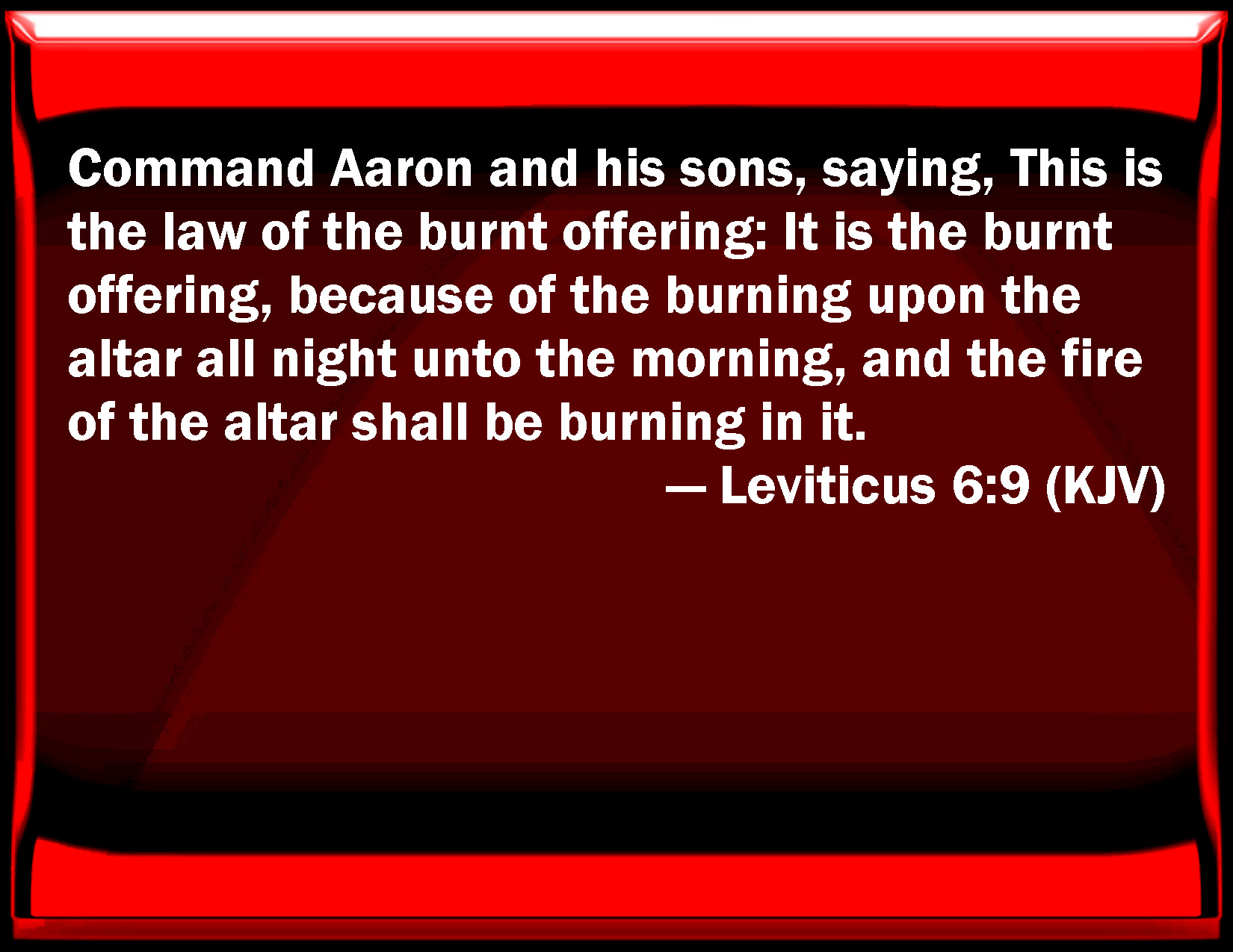 Bible Verse Slide Leviticus 6:9 Command Aaron and his sons, saying, This is the law of the burnt offering: It is the burnt offering, because of the burning on the altar all night to the morning, and the fire of the altar shall be burning in it. KJV: Command Aaron and his sons, saying, This is the law of the burnt offering: It is the burnt offering, because of the burning upon the altar all night unto the morning, and the fire of the altar shall be burning in it. DRB: Command Aaron and his sons: This is the law of a holocaust: It shall be burnt upon the altar, all night until morning: the fire shall be of the same altar. DBT: Command Aaron and his sons, saying, This is the law of the burnt-offering; this, the burnt-offering, shall be on the hearth on the altar all night unto the morning, and the fire of the altar shall be kept burning on it. ERV: Command Aaron and his sons, saying, This is the law of the burnt offering: the burnt offering shall be on the hearth upon the altar all night unto the morning; and the fire of the altar shall be kept burning thereon. WBT: Command Aaron and his sons, saying, This is the law of the burnt-offering: It is the burnt-offering, because of the burning upon the altar all night until the morning, and the fire of the altar shall be burning in it. WEB: "Command Aaron and his sons, saying, 'This is the law of the burnt offering: the burnt offering shall be on the hearth on the altar all night until the morning; and the fire of the altar shall be kept burning on it. YLT: Command Aaron and his sons, saying, This is a law of the burnt-offering (it is the burnt-offering, because of the burning on the altar all the night unto the morning, and the fire of the altar is burning on it,)Links Leviticus 6:9 NIV • Leviticus 6:9 NLT • Leviticus 6:9 ESV • Leviticus 6:9 NASB • Leviticus 6:9 KJV • Leviticus 6:9 Interlinear • Leviticus 6:9 Commentaries • Leviticus 6:9 Parallel Texts • Leviticus 6:9 Bible Apps • Leviticus 6:9 Parallel • Bible Hub |