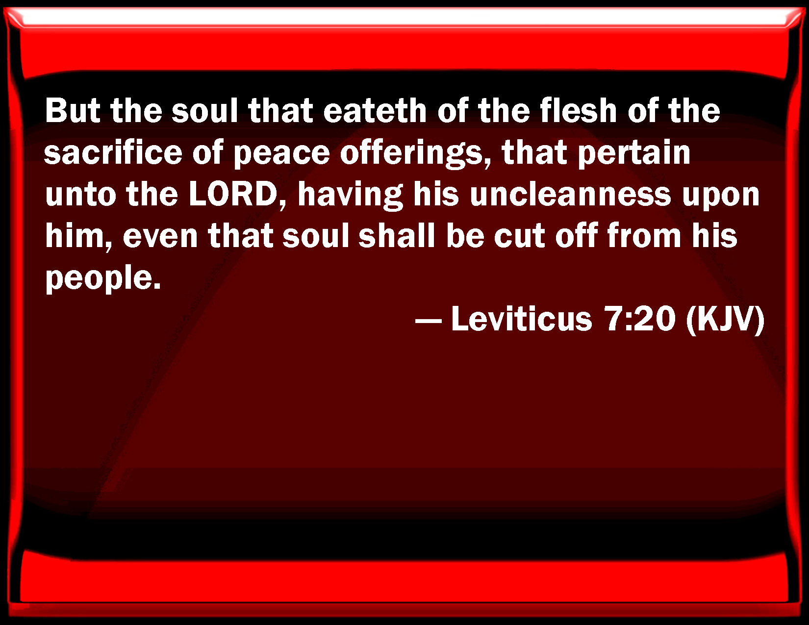 Bible Verse Slide Leviticus 7:20 But the soul that eats of the flesh of the sacrifice of peace offerings, that pertain to the LORD, having his uncleanness on him, even that soul shall be cut off from his people. KJV: But the soul that eateth of the flesh of the sacrifice of peace offerings, that pertain unto the LORD, having his uncleanness upon him, even that soul shall be cut off from his people. DRB: If any one that is defiled shall eat of the flesh of the sacrifice of peace offerings, which is offered to the Lord, he shall be cut off from his people. DBT: But the soul that eateth the flesh of the sacrifice of peace-offering which is for Jehovah, having his uncleanness upon him, that soul shall be cut off from his peoples. ERV: but the soul that eateth of the flesh of the sacrifice of peace offerings, that pertain unto the LORD, having his uncleanness upon him, that soul shall be cut off from his people. WBT: But the soul that eateth of the flesh of the sacrifice of peace-offerings that pertain to the LORD, having his uncleanness upon him, even that soul shall be cut off from his people. WEB: but the soul who eats of the flesh of the sacrifice of peace offerings, that belongs to Yahweh, having his uncleanness on him, that soul shall be cut off from his people. YLT: and the person who eateth of the flesh of the sacrifice of the peace-offerings which are Jehovah's, and his uncleanness upon him, even that person hath been cut off from his people.Links Leviticus 7:20 NIV • Leviticus 7:20 NLT • Leviticus 7:20 ESV • Leviticus 7:20 NASB • Leviticus 7:20 KJV • Leviticus 7:20 Interlinear • Leviticus 7:20 Commentaries • Leviticus 7:20 Parallel Texts • Leviticus 7:20 Bible Apps • Leviticus 7:20 Parallel • Bible Hub |