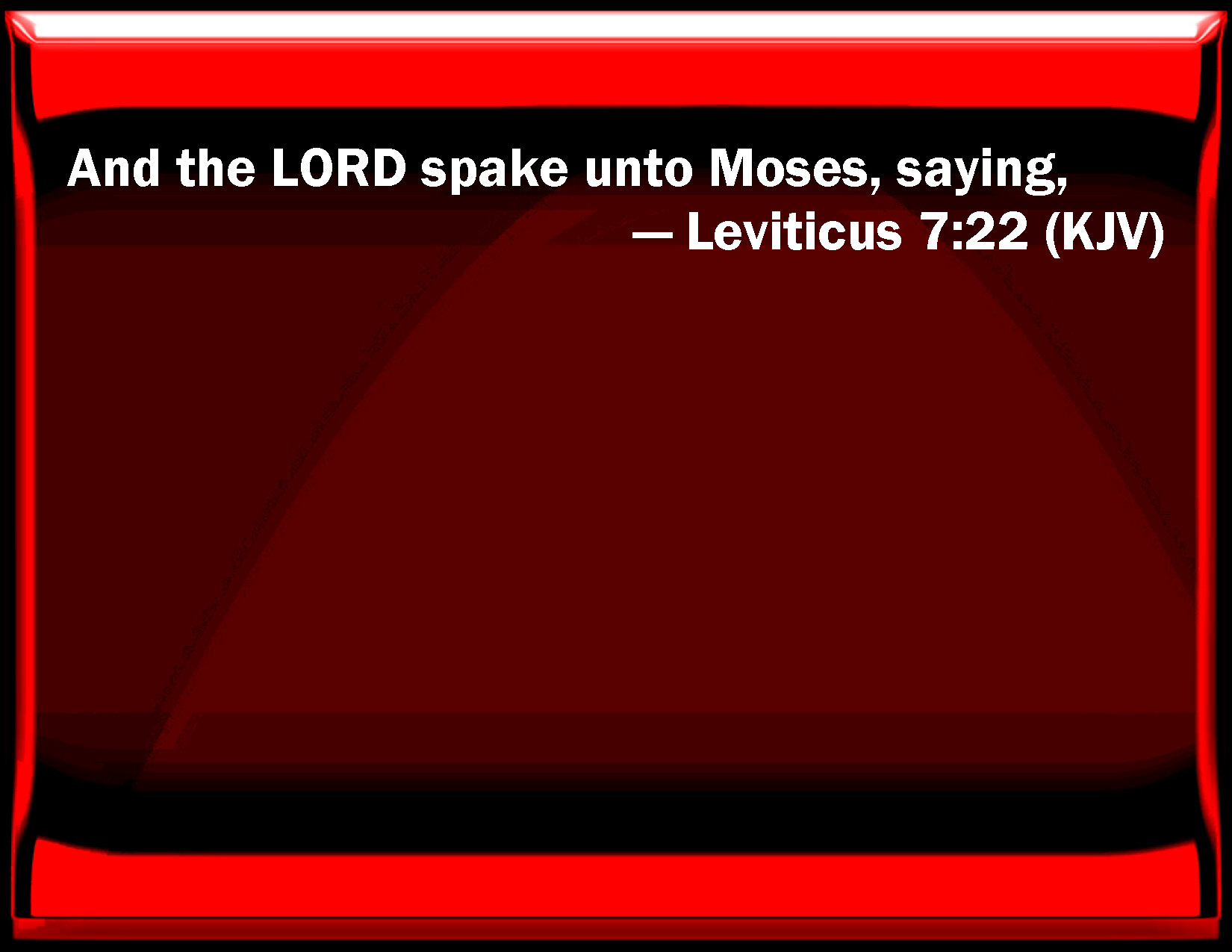 Bible Verse Slide Leviticus 7:22 And the LORD spoke to Moses, saying, KJV: And the LORD spake unto Moses, saying, DRB: And the Lord spoke to Moses, saying: DBT: And Jehovah spoke to Moses, saying, ERV: And the LORD spake unto Moses, saying, WBT: And the LORD spoke to Moses, saying, WEB: Yahweh spoke to Moses, saying, YLT: And Jehovah speaketh unto Moses, saying,Links Leviticus 7:22 NIV • Leviticus 7:22 NLT • Leviticus 7:22 ESV • Leviticus 7:22 NASB • Leviticus 7:22 KJV • Leviticus 7:22 Interlinear • Leviticus 7:22 Commentaries • Leviticus 7:22 Parallel Texts • Leviticus 7:22 Bible Apps • Leviticus 7:22 Parallel • Bible Hub |